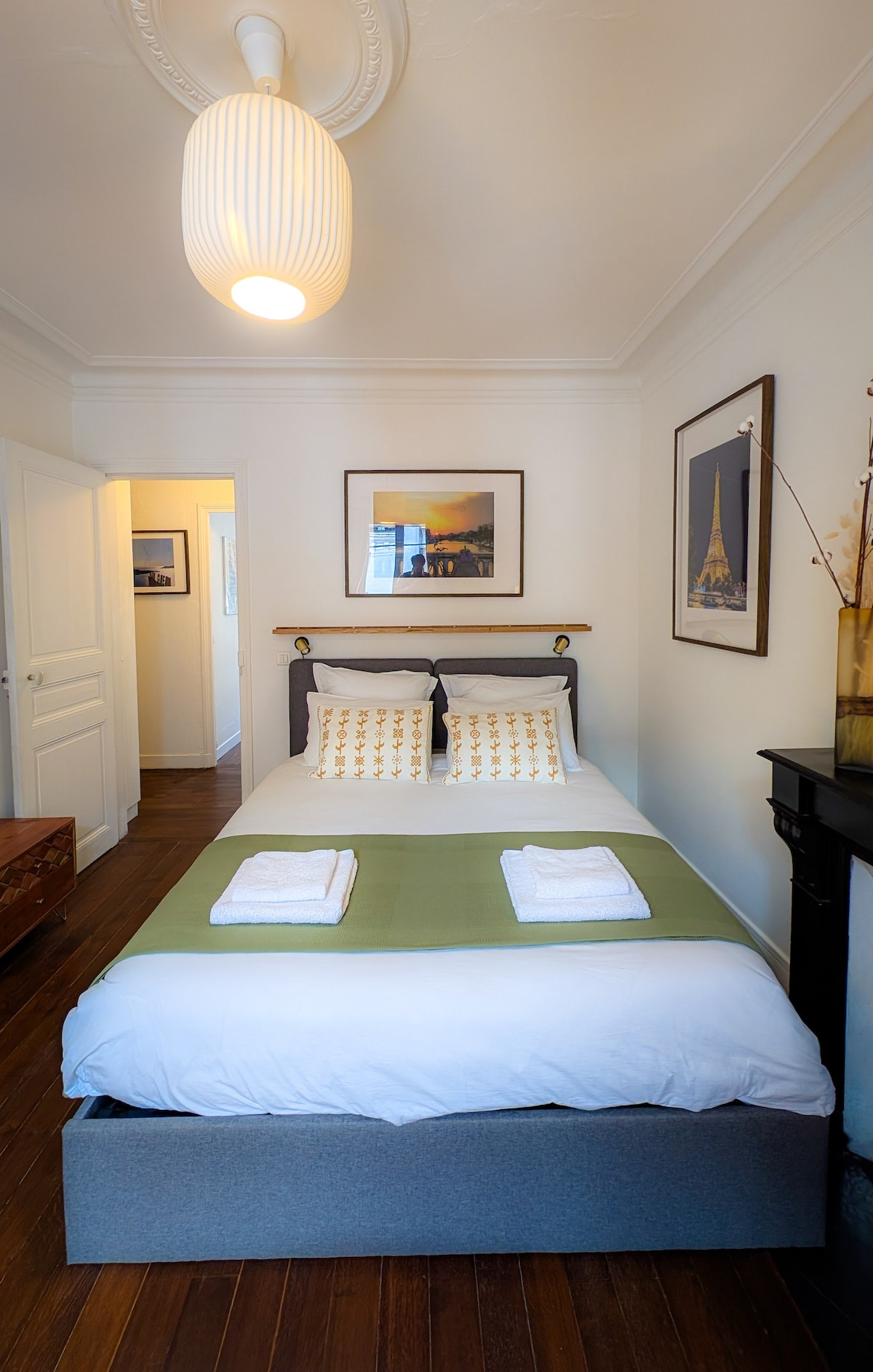 Enjoy our elegant Parisian apartment. We are also happy to share our 15 years of Parisian experiences as well as our tips and habits regarding activities around our neighborhood and in Paris ! The apartment is fully furnished and offers a kitchen open to the living room, a bedroom with a large quality double bed (160×200) and a bathroom. The apartment is located on the 4th and last floor (without elevator: not recommended for XXL luggage)!