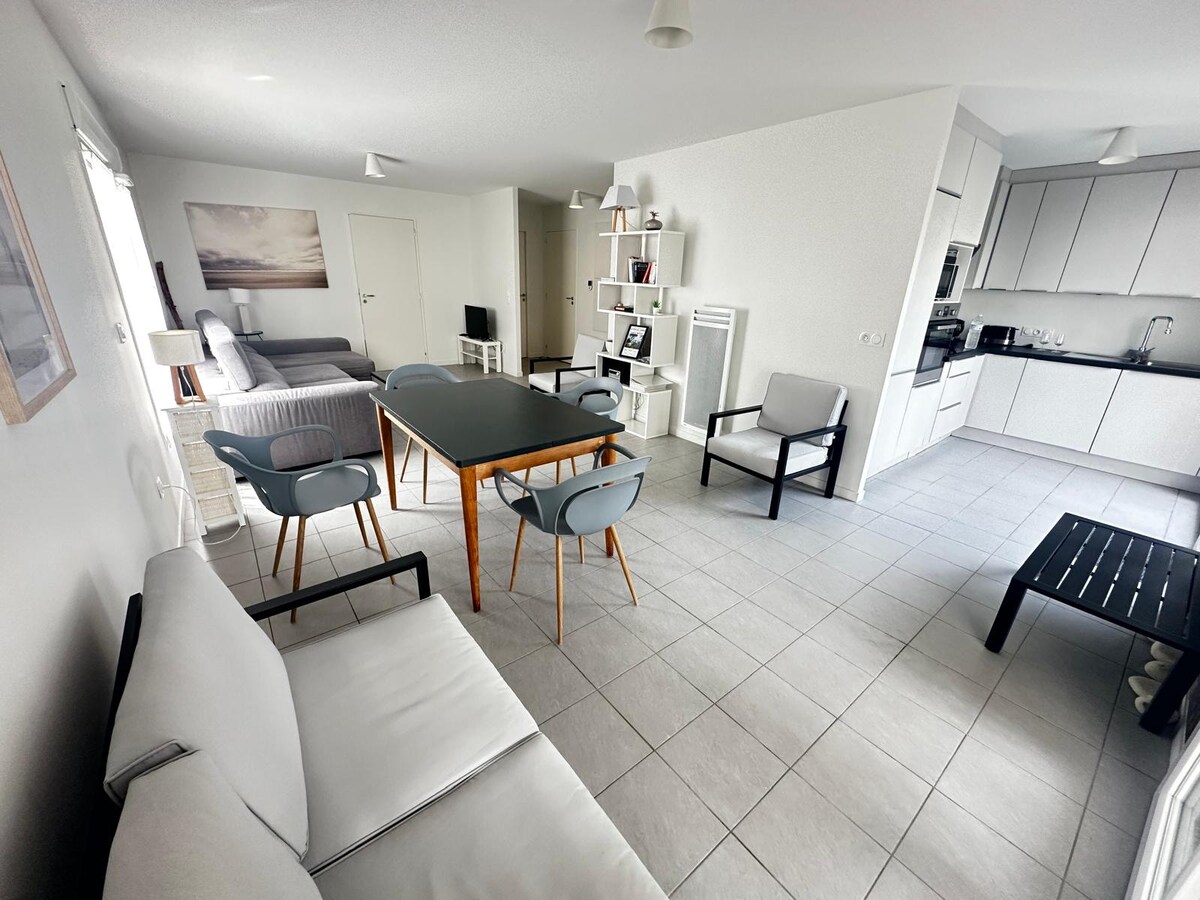 Détendez-vous dans ce logement de "prestige (60m²), calme, confortable, élégant et climatisé, pouvant accueillir 4 personnes. Cet appartement propose des équipements haute gamme, 2 chambres, literie de 160 et TV connectées. Doté d'une décoration soignée. Terrasse ombragée et jardin. "Parking privé" Situé dans un quartier résidentiel à 10 min du centre ville de La Rochelle, de l'aéroport, de l'île de Ré et à 150m d'un carrefour-city, boulangerie, transport en commun, cabinet médical et pharmacie.