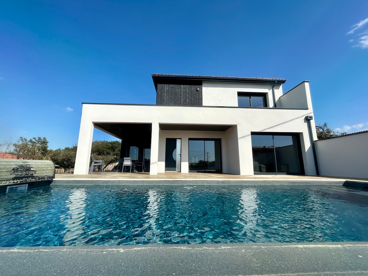 Esta casa bioclimática contemporánea en el campo solo se ha construido en 2021. Se encuentra en un entorno completamente tranquilo. Al mismo tiempo, se encuentra no muy lejos de las playas. El amplio salón se abre a una terraza de madera de 50 m2 y a un jardín con impresionantes vistas panorámicas. Disponible todo el año y también para estancias largas. Internet de fibra disponible para el teletrabajo.
