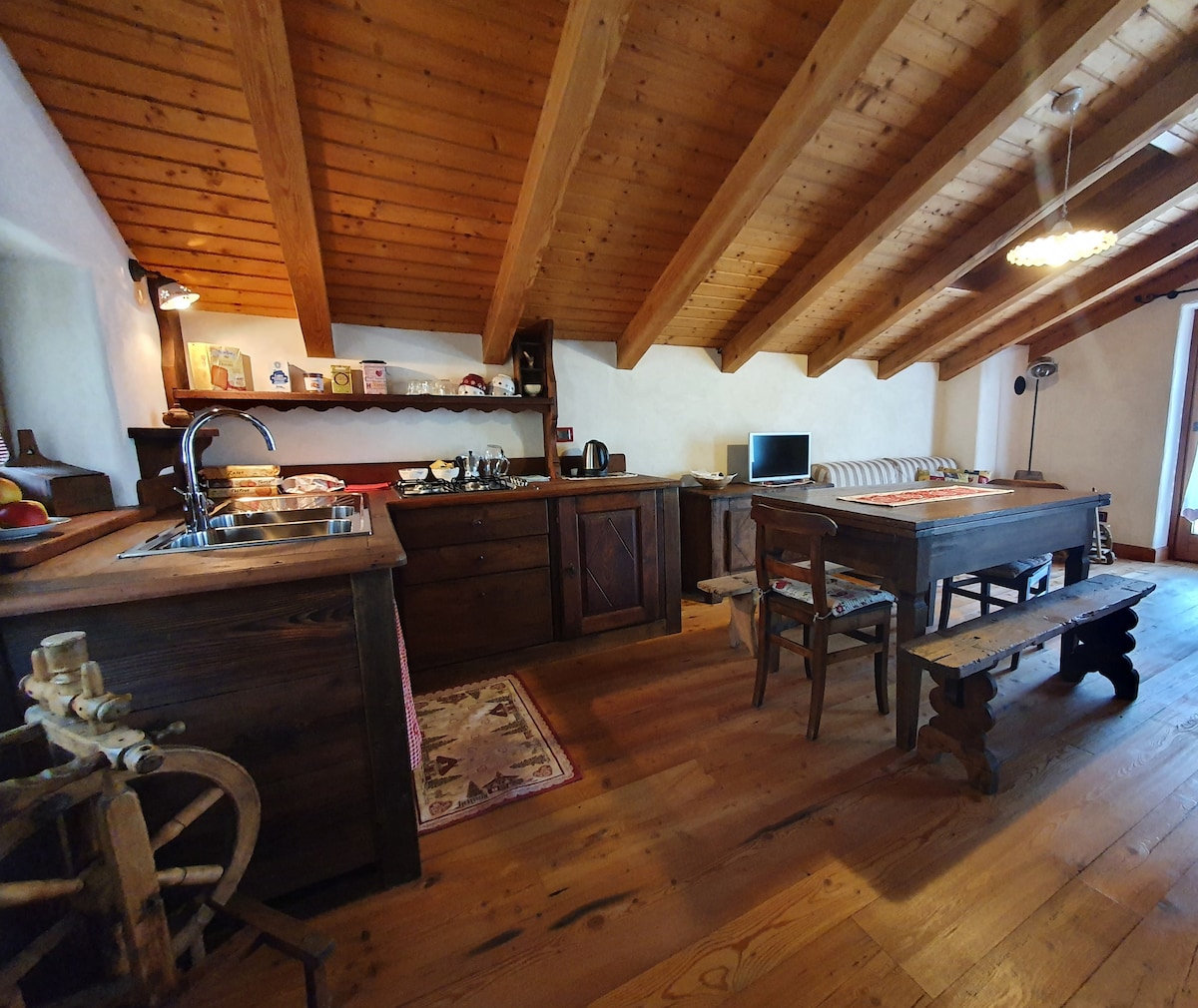 PARFUM D'ANTAN se encuentra en la planta baja de la casa donde viven Italo y Laura y sus hijos Sofía y Matteo. En la reforma, han querido mantener las características originales. El alojamiento está amueblado en estilo de montaña con algunos muebles antiguos de la tradición rural valdostana. Consta de dos habitaciones, una cocina amplia y luminosa y una acogedora habitación con baño. Los espacios tienen paredes revestidas de madera de alerce, de la que se puede apreciar el calor y el aroma.