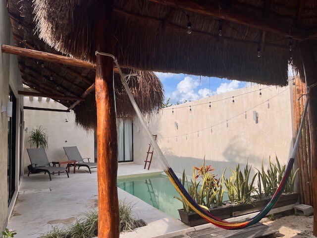 Este espacio cuenta con una amplia cama tamaño king y una atmósfera serena que invita al descanso. La propiedad incluye una alberca cubierta de uso exclusivo, brindándote privacidad y protección del sol, así como una hamaca para disfrutar momentos de relajación total. También podrás aprovechar la terraza privada cubierta, perfecta para cenas tranquilas, charlas nocturnas o disfrutar de unas copas al aire libre.