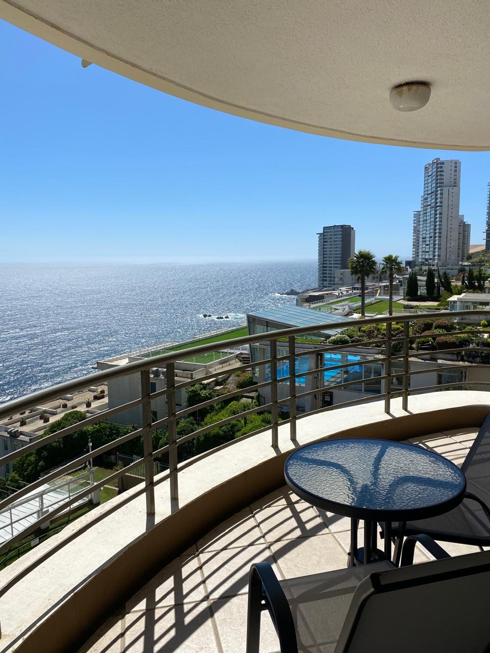 Lindo departamento estudio, con amplia y espectacular vista al mar en 180° desde Valparaíso a Concón, en piso 22, cerradura digital con clave, terraza cerrada con cortinas de cristal plegables, estacionamiento privado con portón eléctrico (control remoto), Wifi, TV Cable, piscina interior y exterior, conserje las 24 horas. Ubicado entre Reñaca y Concón, frente a supermercados, farmacias, panaderías.