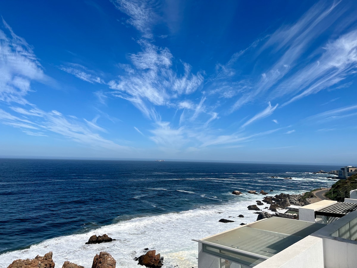 ¡Vista al mar 180° que enamora! Gran terraza, cocina equipada 🍳, calefacción central 🔥, 2 TVs (Salon & dormitorio) + internet 💻, 2 piscinas (1 climatizada) 🏊, jacuzzi, gym 💪, estacionamiento privado cubierto 🚗 y seguridad 24h. Supermercados, farmacia, bencinera y shopping 🛒 a 5 min. Playas a 5 min en 🚗 y transporte a 2 min. Perfecto para parejas 💑 y familias. Incluye sábanas y toallas 🛏️. ⭐ Superhost 5⭐! 📖 ¡Lee los comentarios y reserva con confianza! Quincho disponible por $30.000 🔥