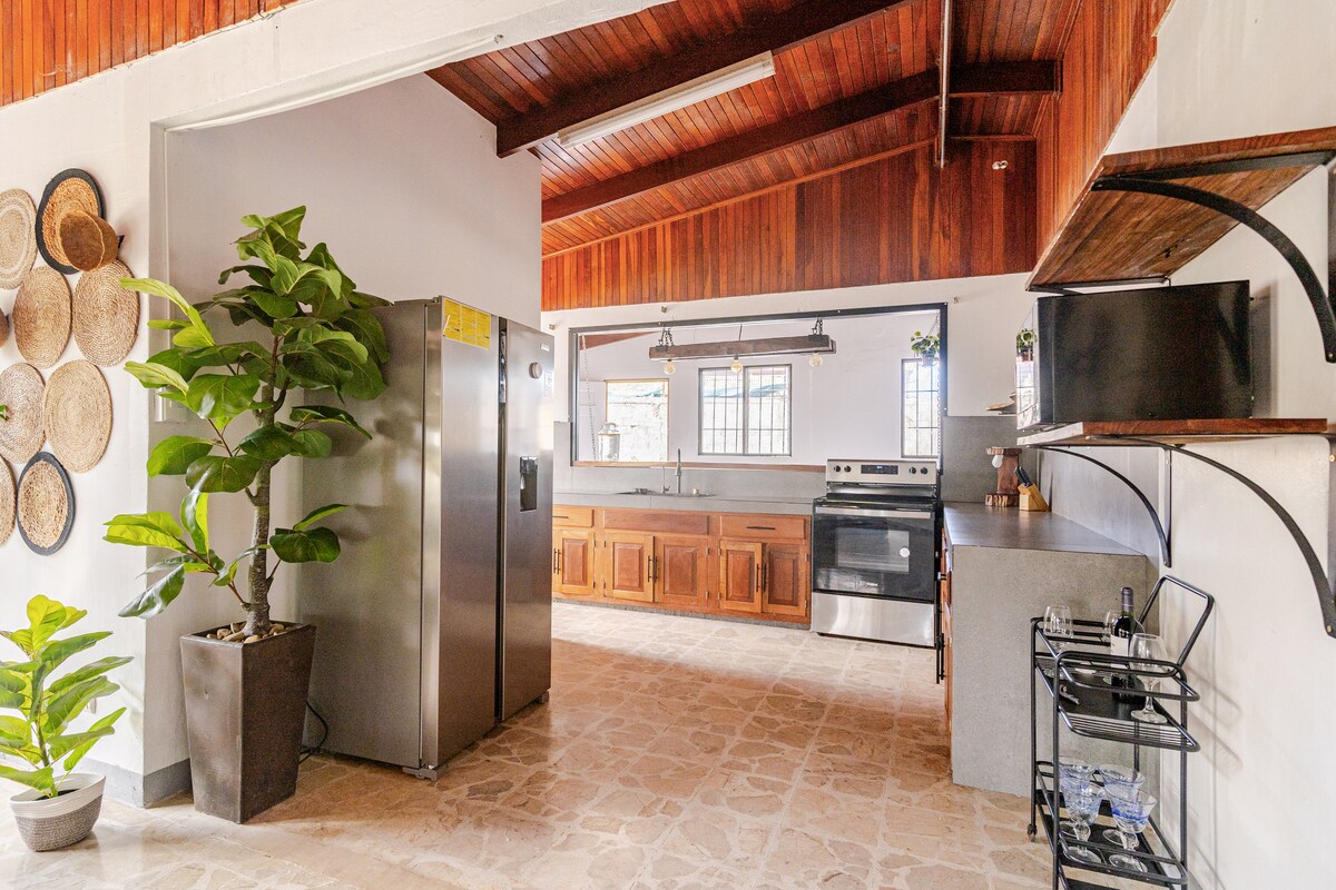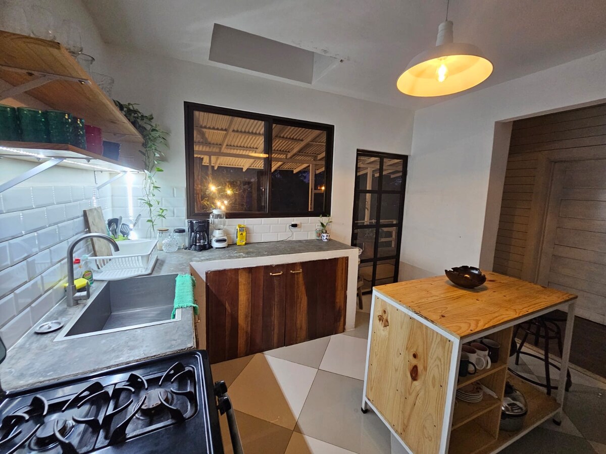 Villa Bamboo es una hermosa casa de nueva construcción a 100 metros de la playa de Copal. Este nivel superior tiene 2 dormitorios: uno con cama tamaño king con aire acondicionado, otro con cama tamaño queen y cama individual con ventilador, un baño con lavadora, una gran cocina, un gran solárium y una sala de estar con aire acondicionado. Entrada privada en la parte trasera de la casa. Buen wifi. Aparcamiento privado y piscina en la parte trasera. No hay vecinos en 3 lados de la propiedad. Kiteboardingcostarica, la escuela de kitesurf, está justo aquí, en la playa de Copal.