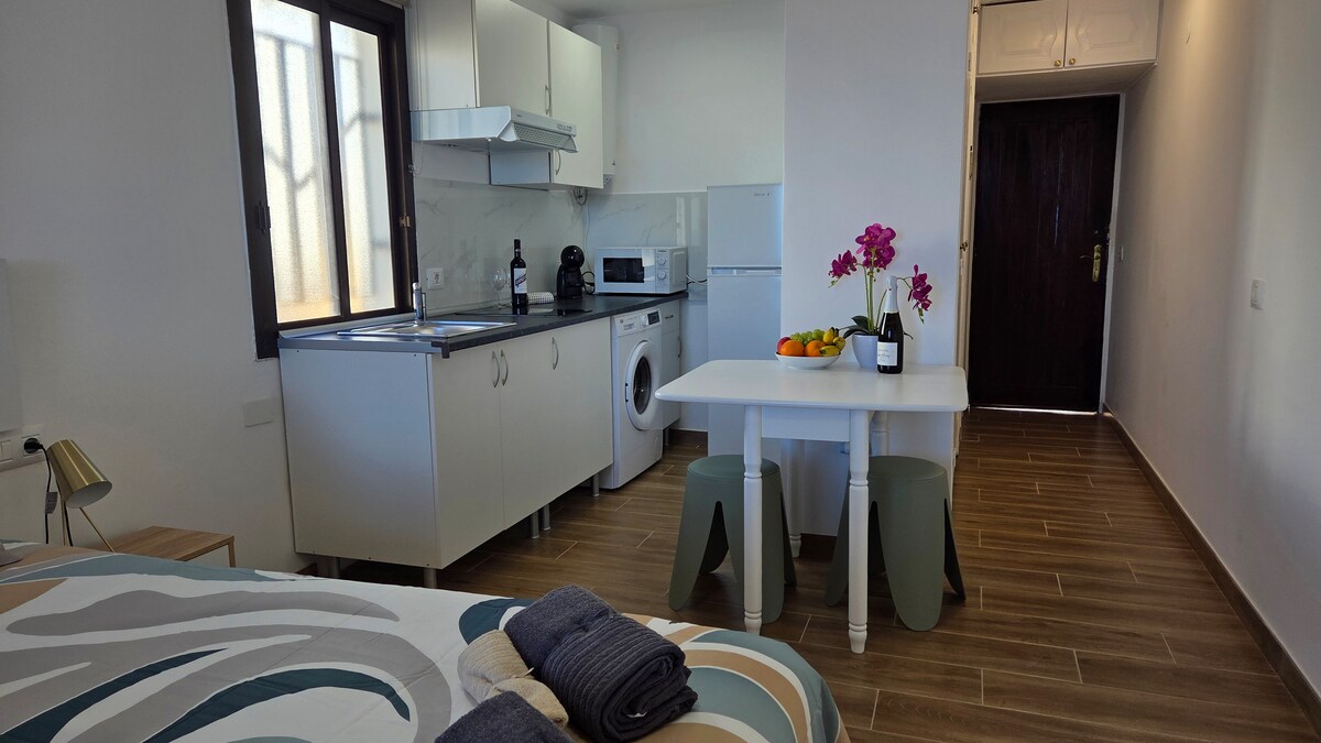 Bright studio just a short walk from Playa de la Arena, with open views of the Atlantic Ocean and La Gomera. The open-plan space features a queen-size bed, air conditioning, and a small private terrace, perfect for morning coffee or sunset drinks. Set slightly away from the front line, it offers a quieter stay while remaining close to the beach, restaurants, and shops. Free parking included. Ideal for couples or solo travellers looking to relax and enjoy Tenerife’s sunsets.
