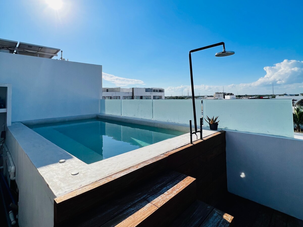 Impresionante ático de 2 recámaras con PISCINA PRIVADA en tu azotea del 4º piso, ideal para disfrutar en privacidad del sol o una bebida romántica. La amplia cocina de madera cuenta con encimera de mármol, refrigerador grande, microondas y todos los utensilios necesarios.. Equipado con 3 ventiladores de techo y 3 A/C potentes para tu confort. Con internet súper rápido de 120 MB y 2 HD Smart TV de 41” con acceso a Netflix, YouTube y más. ¡Una escapada perfecta te espera en este elegante refugio!