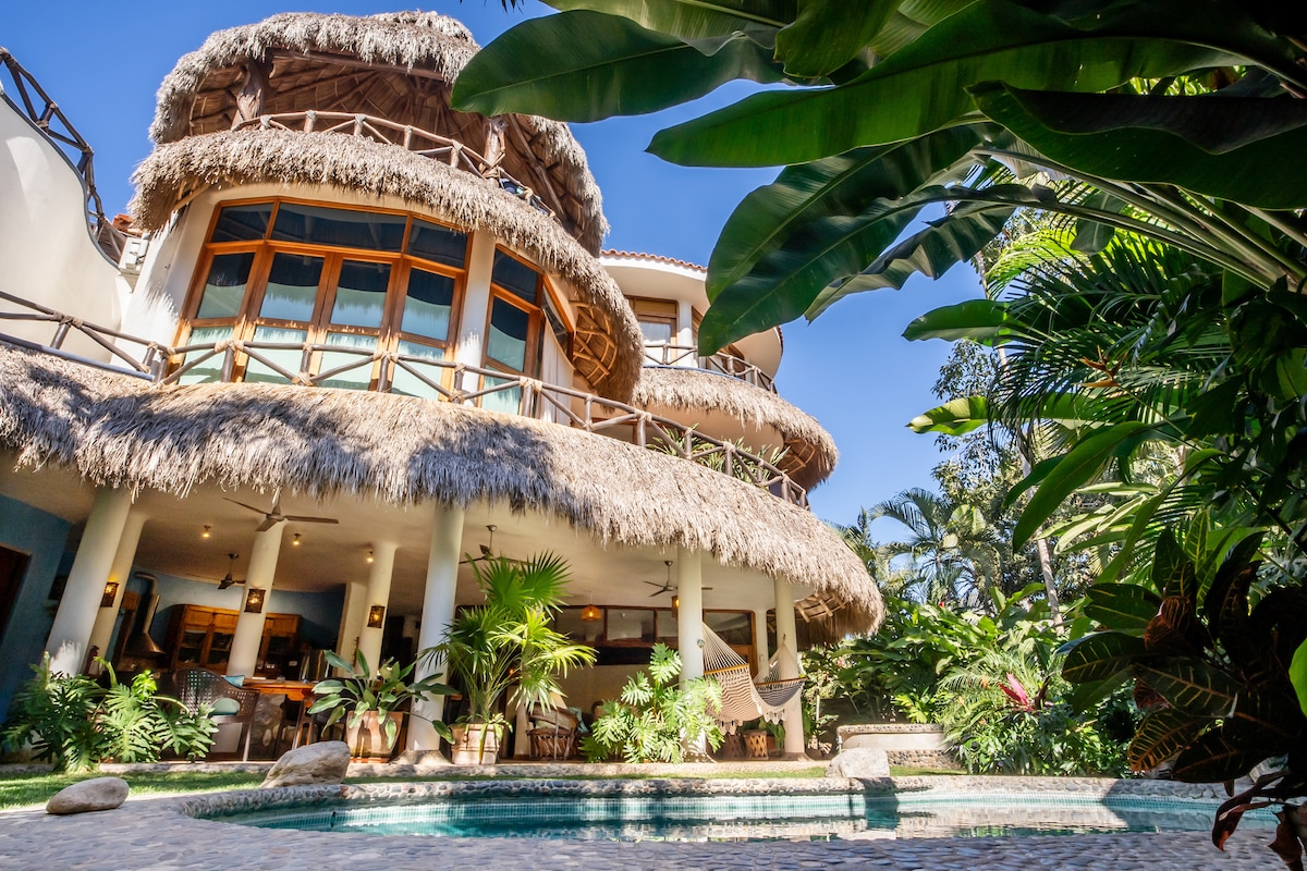 Una casa privada tropical que ofrece acceso rápido a la plaza Sayulita y al océano Pacífico, esta casa se encuentra en una ladera bellamente ajardinada en un barrio residencial. Un administrador de la casa está disponible todos los días para cualquier problema o pregunta que surja durante su estadía. Las evaluaciones han señalado que este alojamiento es aún más hermoso que la descripción, comentando “No estoy seguro de si 5 estrellas es suficiente para dar un lugar y personal tan increíbles”.