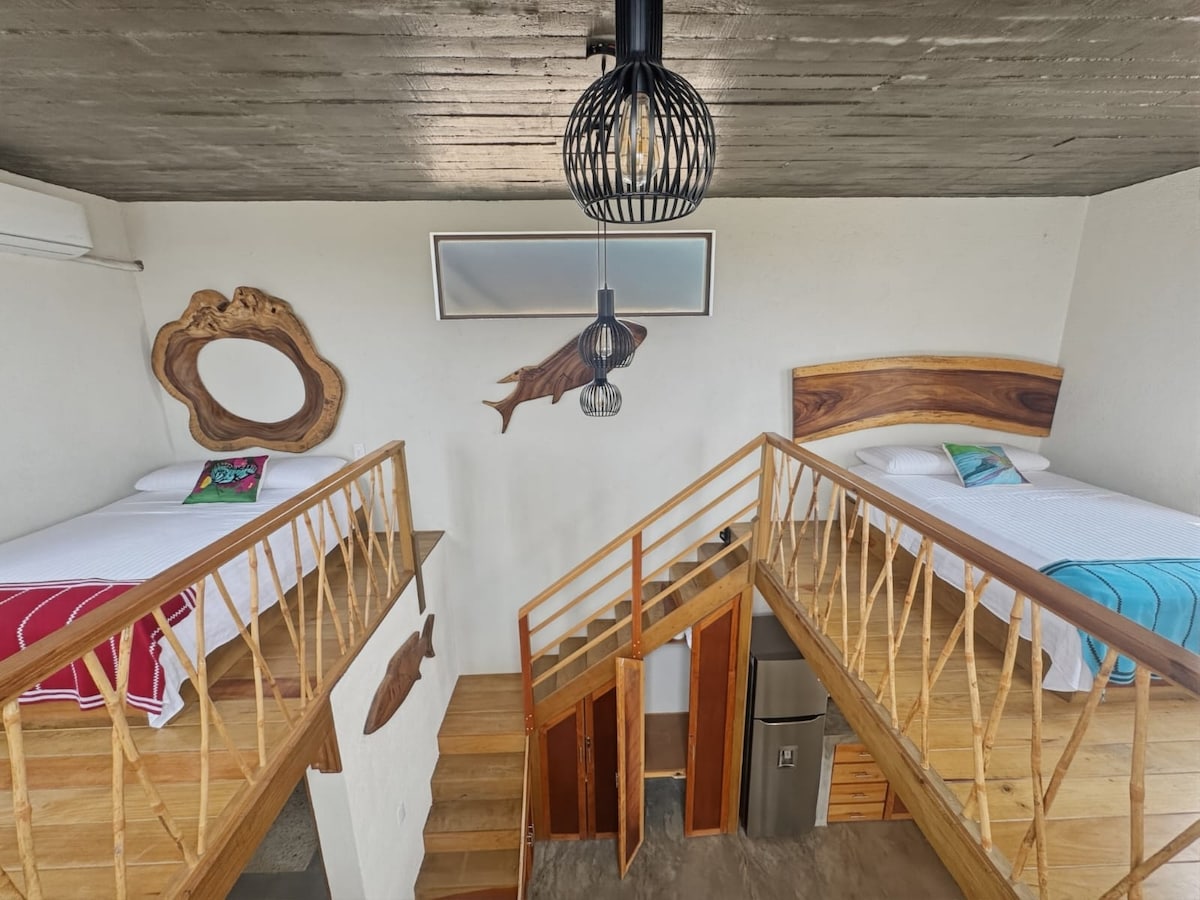 Cabaña estilo Loft con vista al océano, diseño al interior de doble altura con mezanine para las dos camas y privacidad, lo más increíble son las vistas del atardecer, el bosque, por las noches disfrutar de las estrellas y los sonidos naturales del mar por las noches que hace cómodo y agradable el lugar para disfrutar en pareja o familia de una estancia diferente a lo acostumbrado y relajarte rodeado del campo. Baño completo, cocina, comedor, palapa, hamaca, aire acondicionado, tv, WiFi.