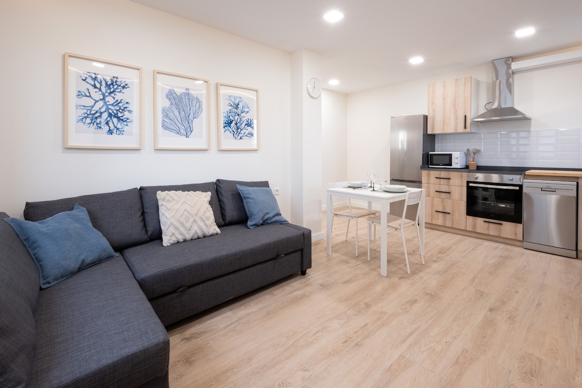 A 50m del Auditorio Príncipe Felipe, apto. de 55m2 útiles, con 1 dormitorio con cama matrimonial de 150 x 190 cms y mesa de despacho para el teletrabajo, Salón-comedor-cocina, con sofá-cama de dos plazas, baño completo muy amplio y terraza con mesa y sillas. Reforma integral y completamente equipado. Cuenta con WIFI rápido y dos Smart TV, una de 55" en el salón y de 32" en el dormitorio. A 70 m está el parking Auditorio que para estancias de 2 ó más noches hacen un precio muy bueno. 2 ASCENSORES