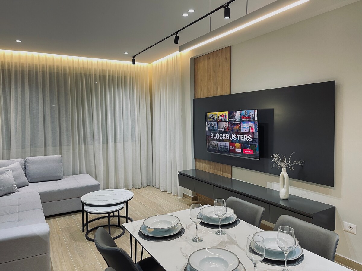 Toda la artesanía y la creatividad de uno de los mejores estudios de diseño de interiores de Albania se ha vertido en este apartamento. Un espacio impregnado de sencillez mediterránea, elegancia minimalista y un sutil “ambiente vacacional” en cada rincón. Todo esto está envuelto en 70 m² de comodidad, incluido un generoso balcón de 10 m² donde puedes disfrutar de vistas al parque acuático y a las ondulantes colinas que rodean el pueblo de Golem.