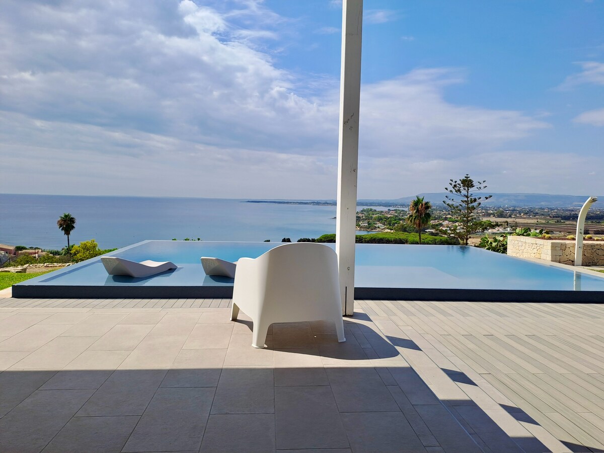 Nel cuore dell'area marina protetta del Plemmirio, villa indipendente di 90mq con piscina a sfioro infinito di 80mq, riscaldata, che offre una vista panoramica mozzafiato sulla costa siciliana dal Plemmirio sino a Capo Passero. La villa è circondata in da un parco di proprietà di 8000 mq ricco di vegetazione tipica siciliana (ulivi, carrubbi, mandorli, pini mediterranei, alberi di gelso, alberi di fico, giardino roccioso con macchia mediterranea).