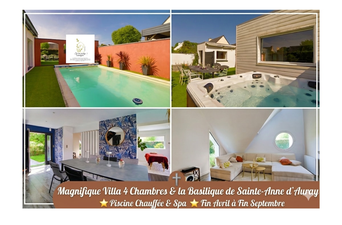 Détendez-vous dans notre logement calme et élégant. Maison située à Sainte-Anne-d’Auray, proche de la Basilique et à 25 min des plages du golfe ou de l’océan. Découvrez notre havre de paix dédié au bien-être et à la relaxation. 4 chambres, 2 salles de bains, cuisine ouverte sur séjour, double salon. Jardin paisible avec piscine et jacuzzi chauffés de fin avril à fin septembre.