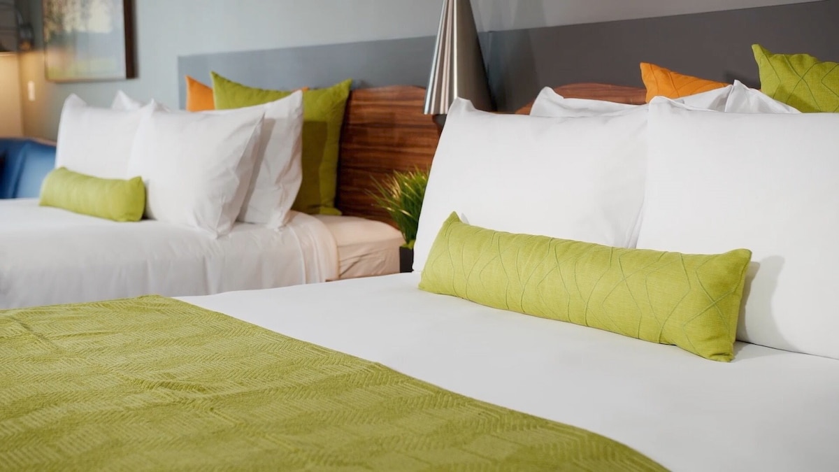 Amplia suite de 2 dormitorios con balcón, parque acuático y sala de juegos.