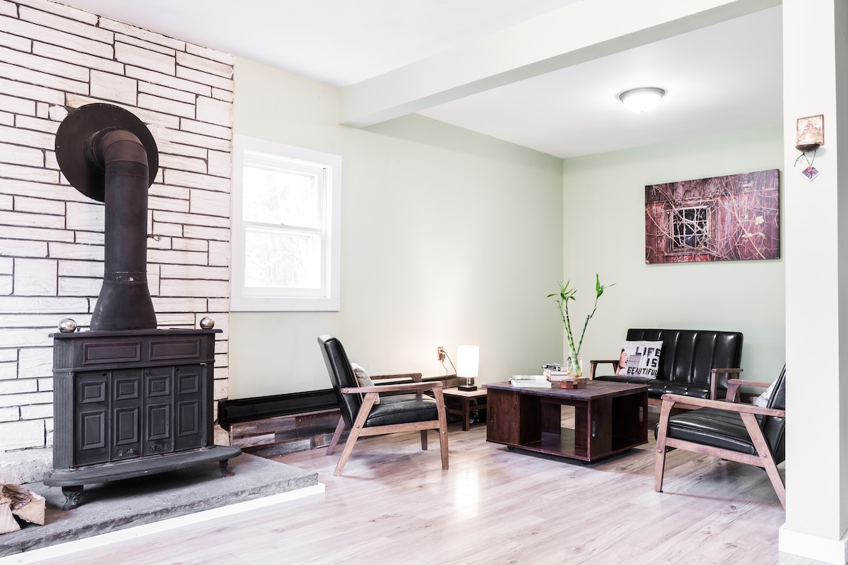 Recientemente destacado en Vogue como uno de «Los mejores Airbnb en el norte del estado de Nueva York para un fin de semana lejos de la ciudad»: una acogedora escapada al norte del estado en 2 acres de hermosa tierra de Catskill. Está a solo 8 minutos de Woodstock, a 5 minutos del pueblo de Saugerties y a pocos minutos de senderismo, esquí y natación. Todo el segundo piso ha sido recientemente renovado, incluido el baño y ambos dormitorios. El primer piso es un diseño abierto con cocina, sala de estar y comedor que conducen a la terraza del patio trasero.