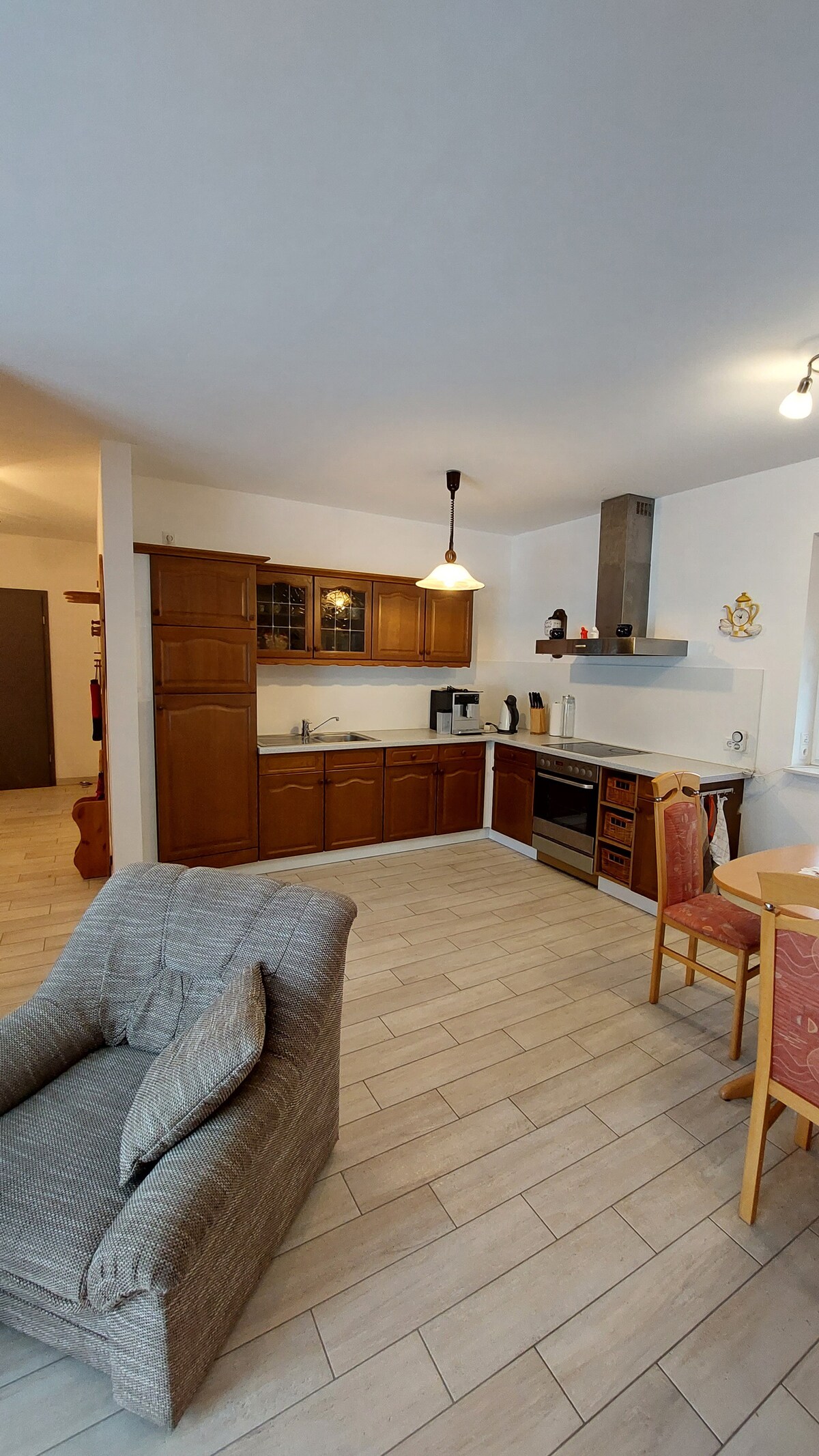 Apartamento de 30 m² en una casa renovada para dos familias Entrada Habitación principal cama de 1,60 m, sofá (con función para dormir 1,30 m de ancho), mesa de comedor diseñada como aparador Cocina totalmente equipada (electrodomésticos de primera calidad, café, té, chocolate para beber gratis) lavabo doble opuesto a la izquierda de la entrada a la ducha de efecto lluvia abierta a la derecha del inodoro (puerta con cerradura) el. persianas enrollables habitación principal e inodoro Plicidades en todas las ventanas ¡Los vehículos se pueden estacionar directamente frente a la propiedad (callejón sin salida)! Patio aún no reformado