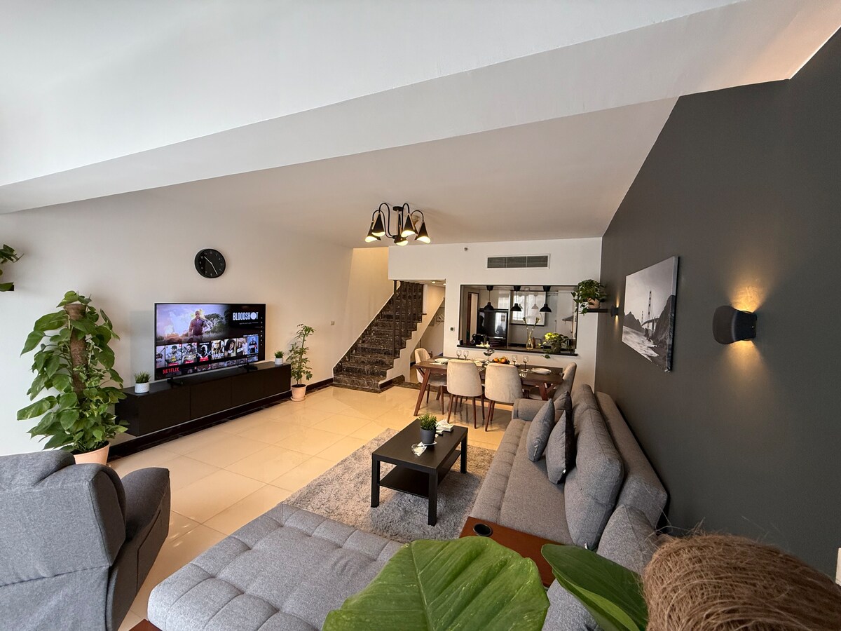 Tu familia estará cerca de todo cuando te hospedes en este lugar céntrico, Todos los centros comerciales y servicios en el nuevo El Cairo están dentro o alrededor de ese lugar Todo lo que puedas necesitar en ese lugar Justo enfrente de la calle de los 90 La unidad está frente a la piscina El lugar tiene pocas piscinas Lugar increíble para pasar un buen rato con familiares y amigos En el centro de New Cairo' El lugar tiene 2 dormitorios 3 camas 3 baños, Gran sala de estar con sofá cama, vista a la piscina, 2 plantas con una cocina abierta totalmente equipada.