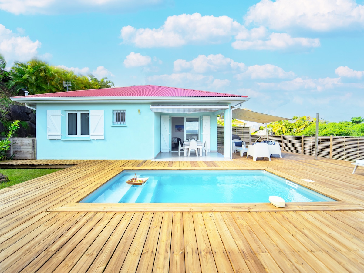Turtle Bay Locations Grande Anse - Martinique Mini Villa T1 en hauteur offrant une vue panoramique sur la mer et la campagne. Accès mer à 50m à pieds. Plage connue pour ses nombreuses tortues vertes visibles en palme masque tubas toute l’année. Composée d’une chambre climatisée avec moustiquaire, une salle de douche avec WC, une cuisine équipée sur la terrasse couverte et une piscine privée de 2m*3m sur la terrasse découverte. Restaurant TiSable à 50m et petits commerces à 500m.