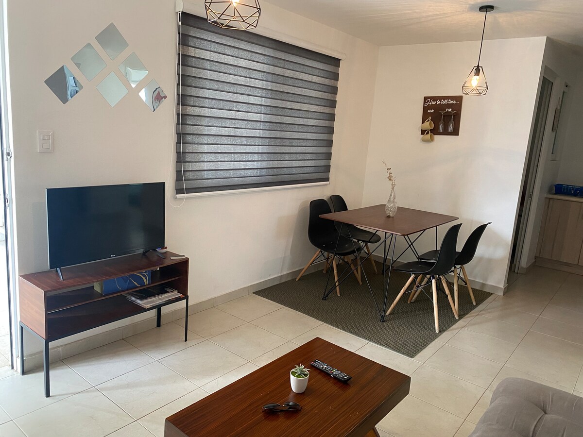 Departamento privado rediseñado en 2019 de 65 metros cuadrados repartidos en 3 habitaciones , 2 camas, localizado en zona con docenas de negocios de comida, 3 cafeterias, 5 farmacias, Bodega de Aurrera, parque de juegos extremos, 2 Oxxos, todo esto en un radio de 1500 metros. Edificio de 3 pisos, el departamento se encuentra en el primer piso, y yo ocupo el tercero. . Niños son bienvenidos. Una cama matrimonial, una pequena para nino y un sofa cama
