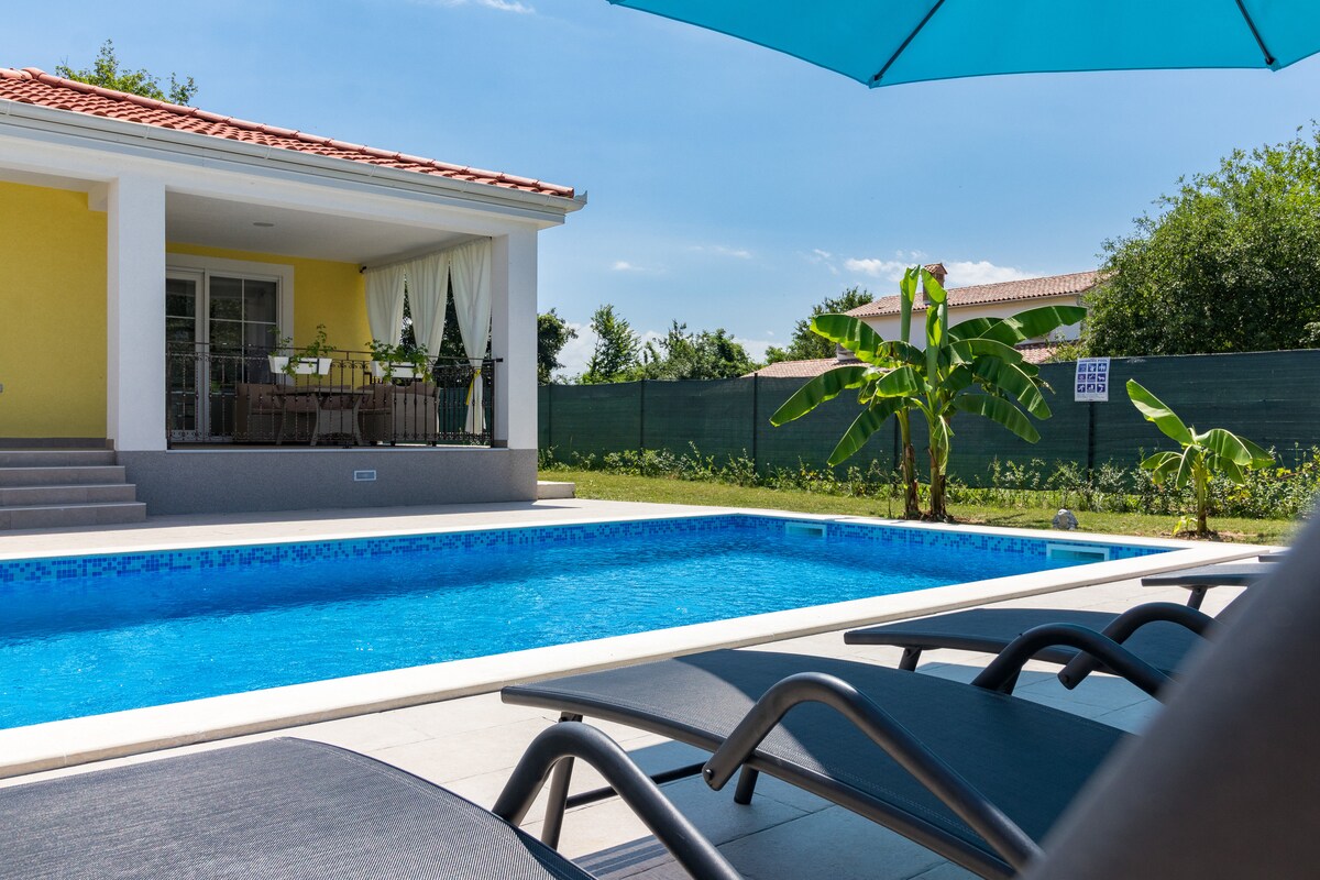 Casa Felicia con piscina al aire libre, ubicada en un lugar pequeño y tranquilo Čepić cerca de Kršan, rodeado de solo dos casas vecinas, prados verdes y viñedos. Esta casa es ideal para aquellos que quieran relajarse en el campo, con una hermosa vista a la montaña Učka, o montar en bicicleta y explorar los alrededores de esta manera. El patio de la casa es rico en contenido infantil, pero con suficiente espacio para jugar y correr.