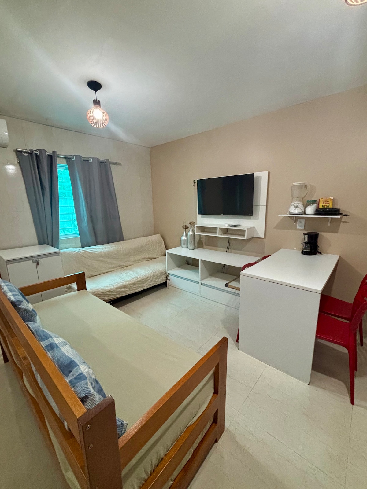 Relaxe neste espaço totalmente CLIMATIZADO.Apartamento único com vista mar, propriedade com acesso a praia e além de uma ótima piscina para adultos e crianças com Decker de madeira que dá visão para o morro do careca , apartamento completo com AR CONDICIONADO NA SALA E NO QUARTO , geladeira , fogão de uma boca por indução, máquina secadora , tv a cabo , wi-fi , estacionamento grátis e rotativo, limpeza diária lugar realmente ótimo para casal passar seu final de semana ou suas férias.