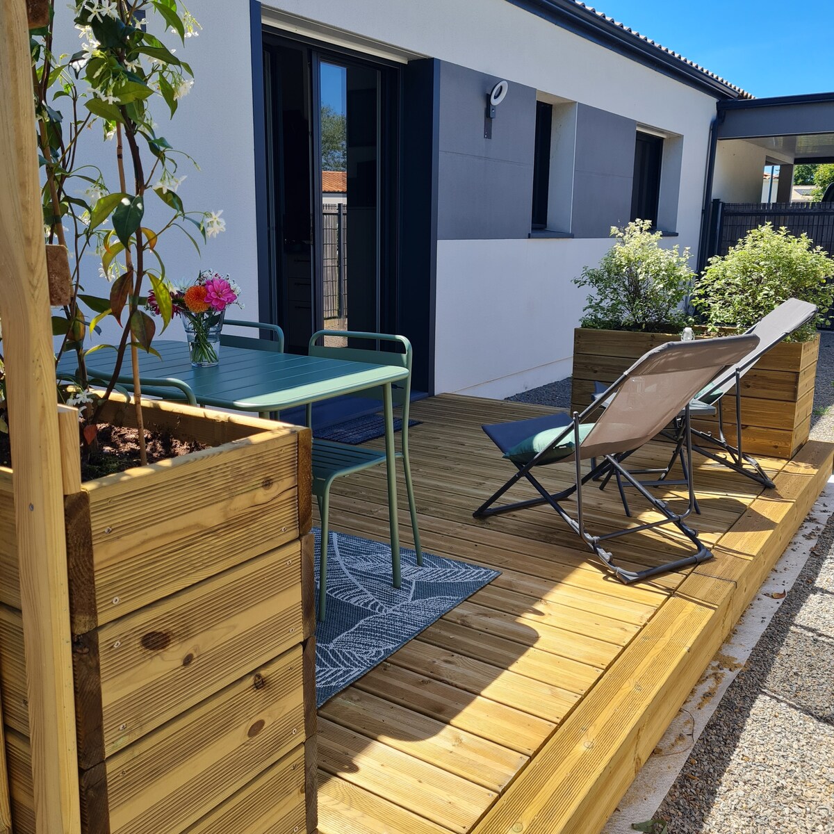 Espacio muy cálido, limpio y cómodo con terraza orientada al suroeste equipada con una mesa y cuatro sillas con vistas al campo de golf de Pornic. Ideal para dos personas que deseen tranquilidad estando cerca de la playa (12 minutos/a pie), el centro de la ciudad (18 minutos/a pie), las tiendas (10 minutos/a pie). Están disponibles: la piscina y dos bicicletas. Flexibilidad de fechas, no dude en llamarme. La tarifa se puede ajustar en función del número de días de alquiler.