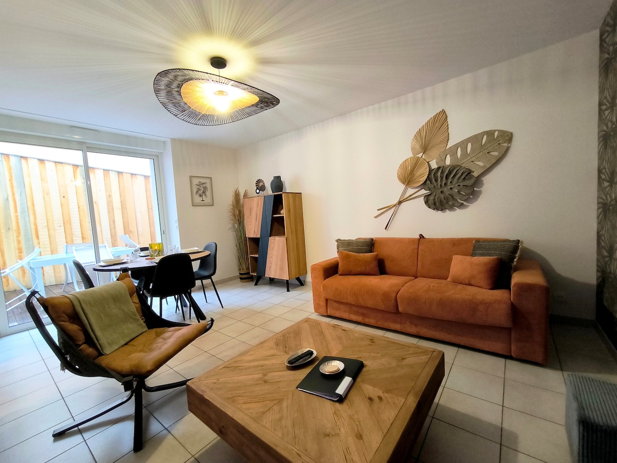 Bonito apartamento decorado con buen gusto por @OMSTYLE HOME de 38 m² + 6 m² de terraza. 3.ª planta con ascensor sin vecinos. Muy tranquilo, dormitorio y sala de estar con vistas a la terraza VISTAS AL MAR y vegetación. En el popular barrio de Gourmalon, cerca de la estación de tren y el puerto, un supermercado y otras tiendas, a 100 m de la Thalasso (tarifas de socios para mis viajeros😁), la playa de la fuente y el magnífico camino de los aduaneros . ¡Un lugar ideal para reponer energías en paz pero cerca de todo!