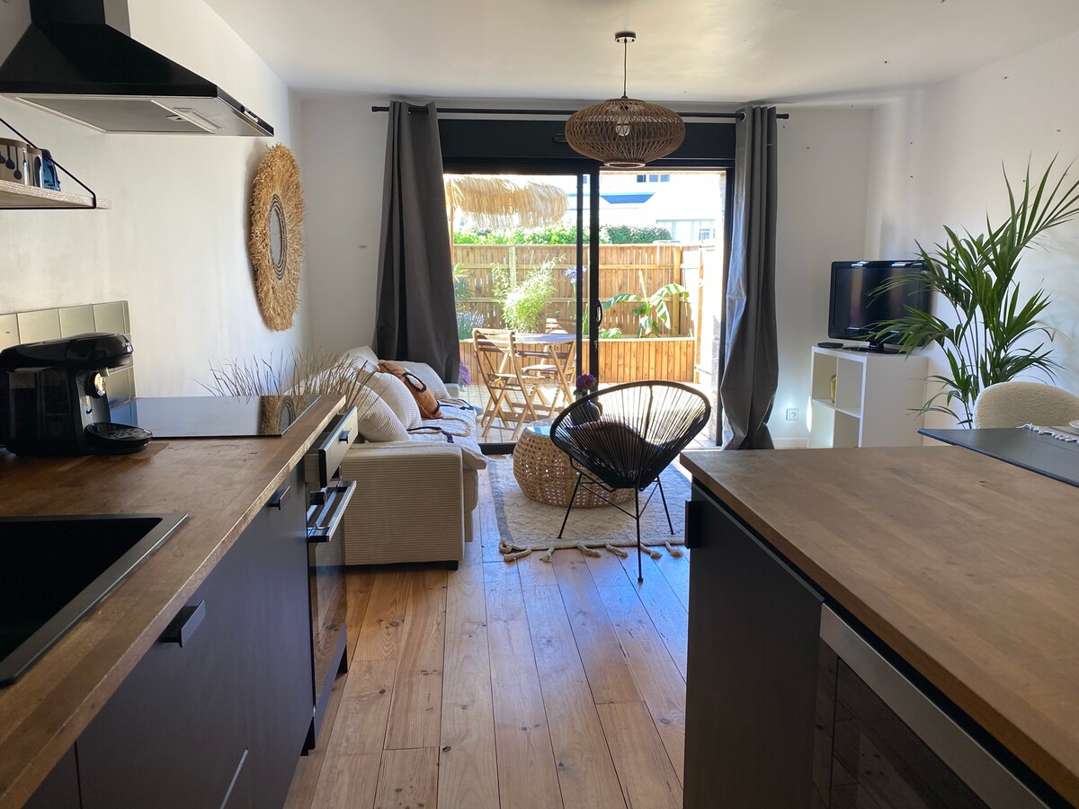 Dúplex para 2 personas de 40 m2 cerca de la costa salvaje y las rutas de senderismo que incluyen en la planta baja: salón/comedor, cocina equipada (placas de inducción, mini horno, microondas, hervidor de agua, cafetera, tostadora, lavadora). Arriba, un dormitorio: cama de 160 x 200 (hecha a la llegada), armarios empotrados, cuarto de baño con inodoro y armario grande (secador de pelo y ropa de baño incluida). 2 exteriores con barbacoa, mobiliario de jardín y estacionamiento.