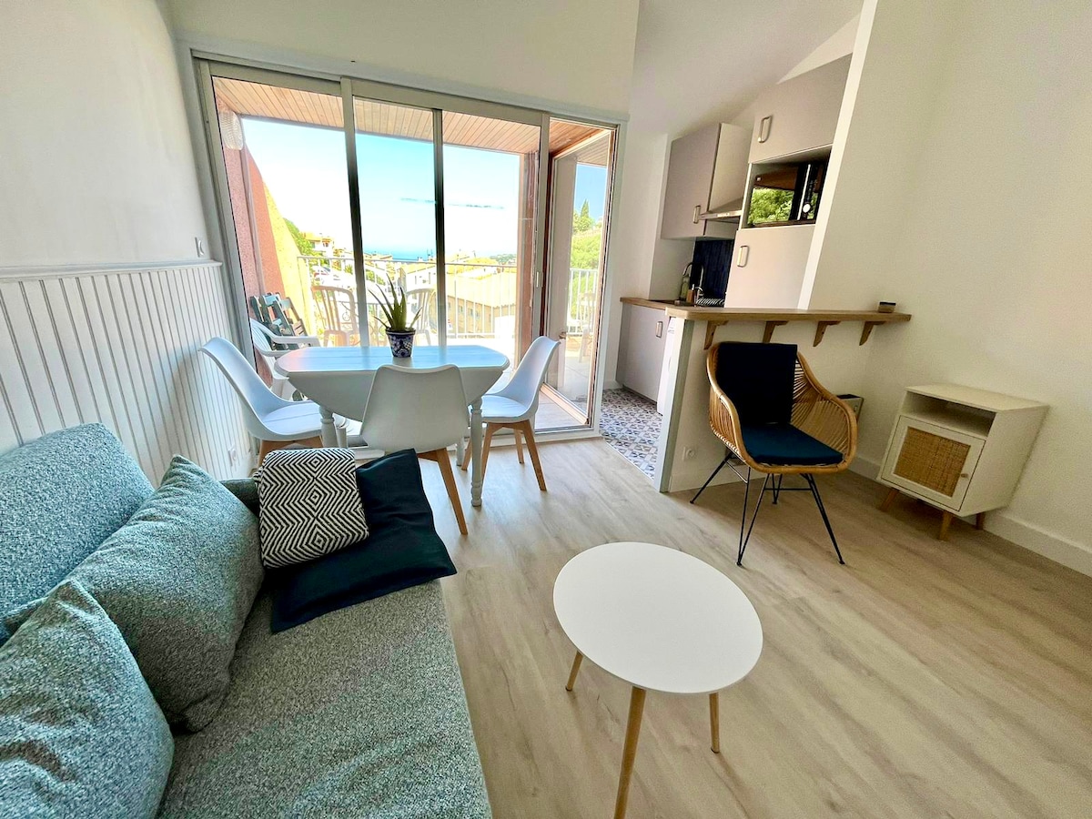 Acogedor. Estudio con aire acondicionado, residencia, piscina, solarium La vista desde la terraza privada y desde el solárium es bastante mágica (Campanario/Bahía/Costa de Rosas desde Port Vendre hasta Leucate) El paseo a pie de un cuarto de hora que le llevará desde la residencia hasta el centro histórico, a lo largo de la orilla del mar, es un verdadero placer. Restaurantes, tiendas, playas y calas a poca distancia. 2/4 couch. habitación «verrière» cama 140 + sofá cama 140.