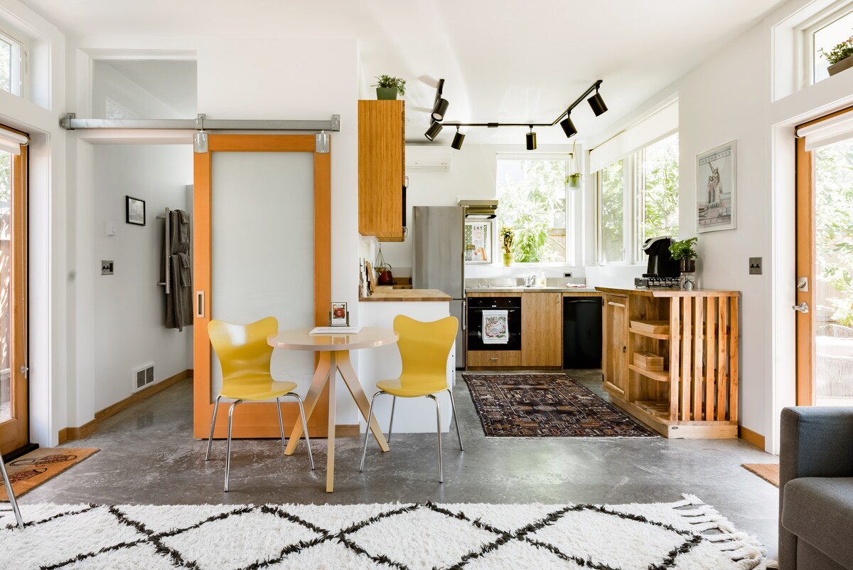 Un lugar enriquecedor con abundante luz, vistas al jardín y acceso a la mejor comida de Portland. «¡El mejor Airbnb en el que me he hospedado!» - Comentario frecuente de los huéspedes. - Premio del Instituto Americano de Arquitectos al diseñador Webster Wilson. - Servicios de lujo y accesorios europeos. - Tranquila calle arbolada del barrio de NoPo, a pocos minutos del centro de la ciudad. - Cocina totalmente equipada con café local fresco. - Comedor en interiores y al aire libre - Consulta los pies de foto para obtener más información. - Se admiten animales de servicio entrenados; no se admiten mascotas ni ESA.