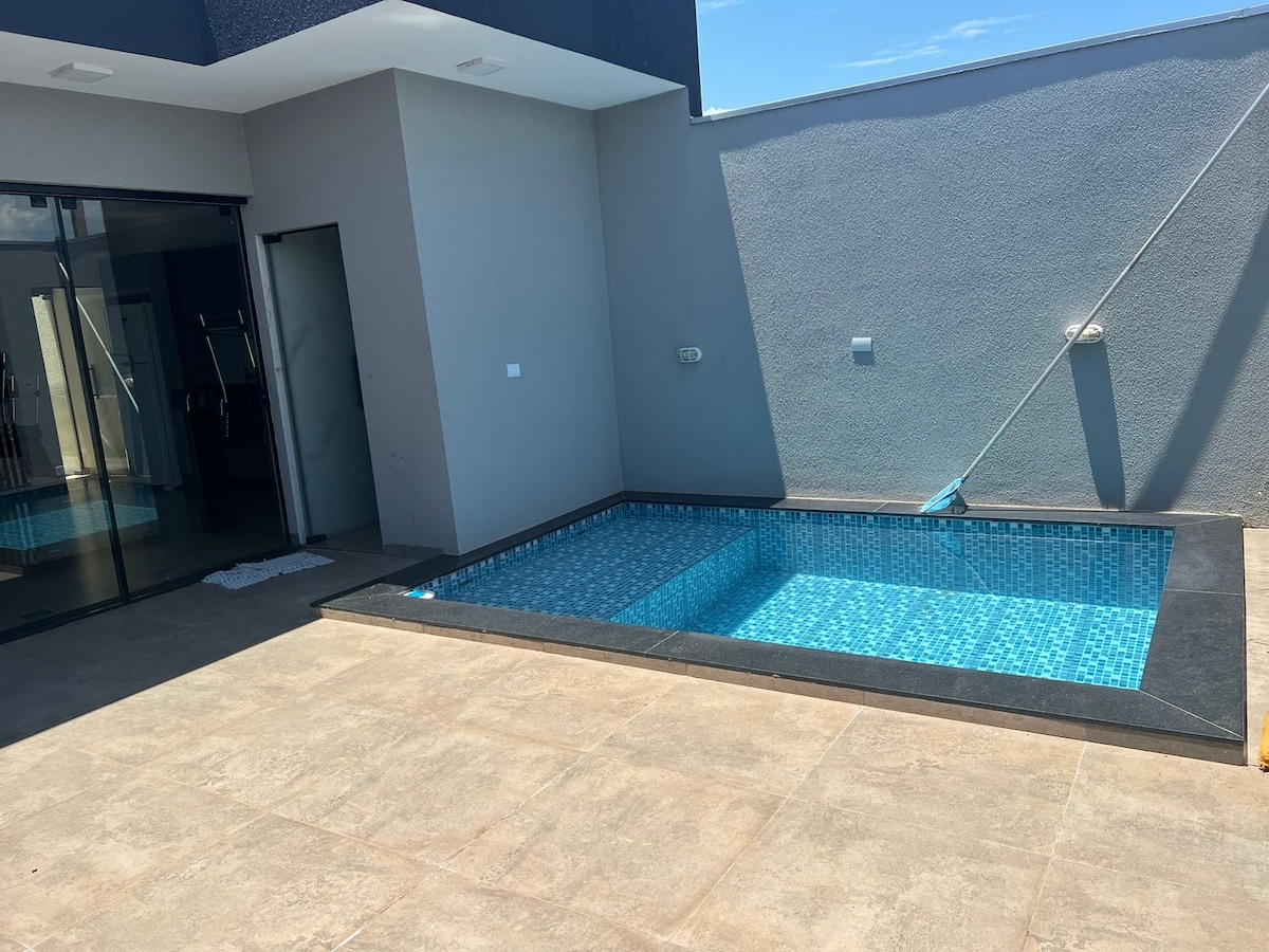 Hermosa casa con piscina y zona gourmet con todos los accesorios, aire acondicionado en todas las habitaciones y ducha con calefacción a gas. La casa tiene una hermosa piscina con cascada, terraza de madera y un gran sistema de sonido tanto para la zona de la piscina como para la zona gourmet.