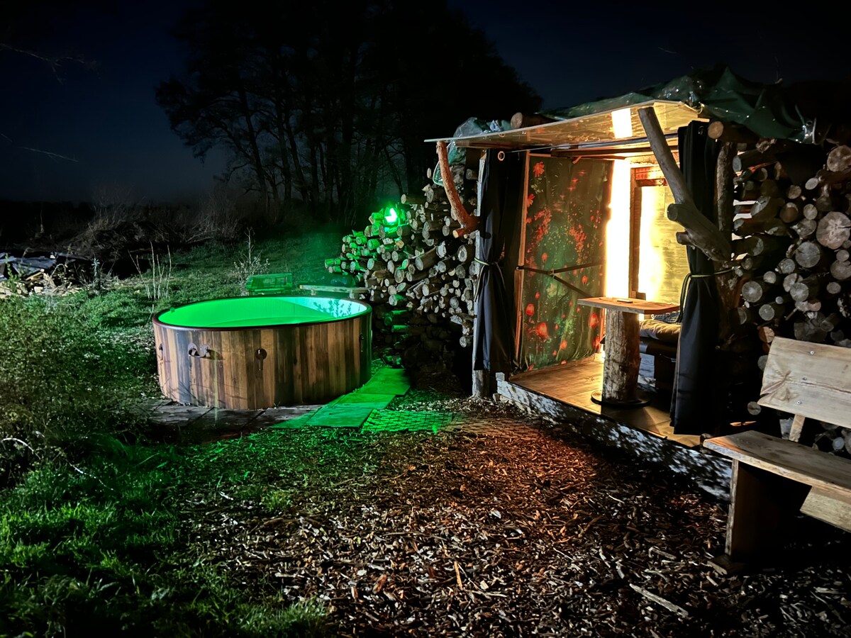 Ein magischer Ort, die Hütte liegt inmitten der Natur an einem wunderschönen Teich. Die Kombination aus Natur und Komfort sucht seinesgleichen. Die Hütte ist in liebevoller Arbeit entstanden und ist neu gebaut. Das Ziel war es modernen Komfort (WLAN, warmes Wasser und bequeme Betten) im rustikalen Stil zu bieten. Der Whirlpool kann vor Ort dazu gebucht werden (40€ pro Aufenthalt) Grillkohle, Anzünder und Holz werden zur Verfügung gestellt. Zudem gibt es Tee, Mineralwasser und Kaffee