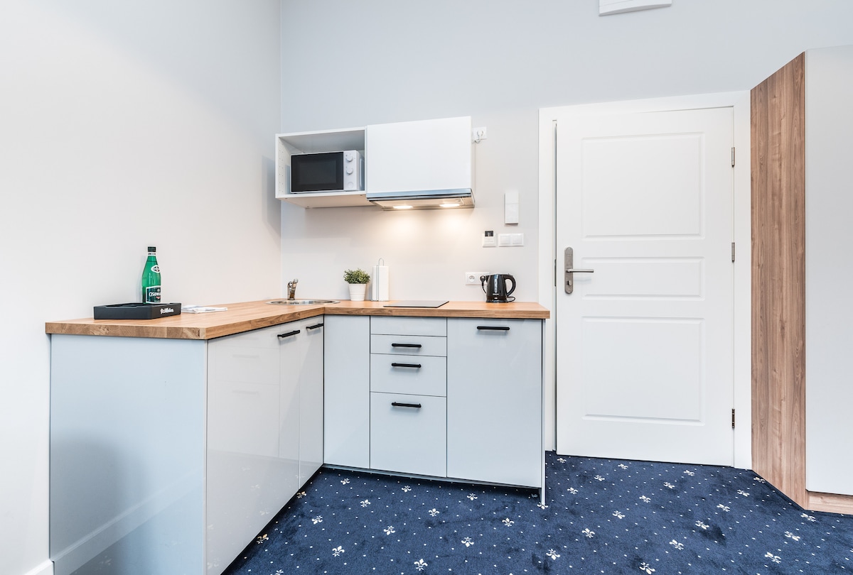 La propiedad ofrece apartamentos estudio dobles totalmente equipados, cómodos y modernos, cada uno de los cuales está amueblado con estilo, un espacio con cocina pequeña, un cómodo baño y un dormitorio. Los huéspedes pueden utilizar TV por cable, Internet de alta velocidad y sábanas y artículos de tocador de hotel de alta calidad. Los interiores cuidadosamente diseñados se distinguen por la atención al detalle, la ergonomía y la funcionalidad, lo que hace que todos se sientan como en casa.