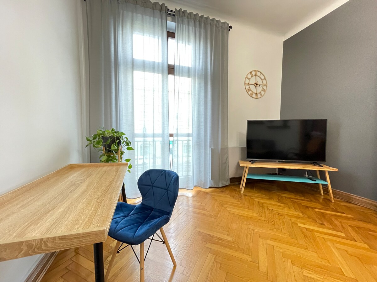 Apartamento original y funcional en Chicago con balcón y vistas al parque y a Stary Browar. El espacio de 32 m² incluye: – una zona de dormitorio separada y acogedora; – una sala de estar para relajarse; – una cocina americana totalmente equipada con lavavajillas; - un baño con ducha; – una plancha, tabla de planchar y lavadora disponibles para los huéspedes en la zona común. El apartamento se encuentra en una casa adosada en el tercer piso sin ascensor: escalones bajos, escalera ancha.