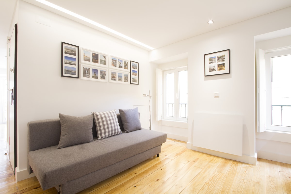 Este es un hermoso apartamento nuevo, totalmente renovado en la mejor ubicación que puedes tener, en el corazón del distrito de Baixa, en el centro de Lisboa. Es de 2 dormitorios con 2 baños, aire acondicionado y ascensor. Cuenta con un largo balcón donde podrás disfrutar de las vistas al río y a una de las calles más conocidas de Lisboa. Esta es la ubicación perfecta, donde encontrarás teatros, librerías, cafés de estilo antiguo, galerías, tiendas, restaurantes, bares, monumentos, el río y miradores, ¡todo a poca distancia a pie! :)