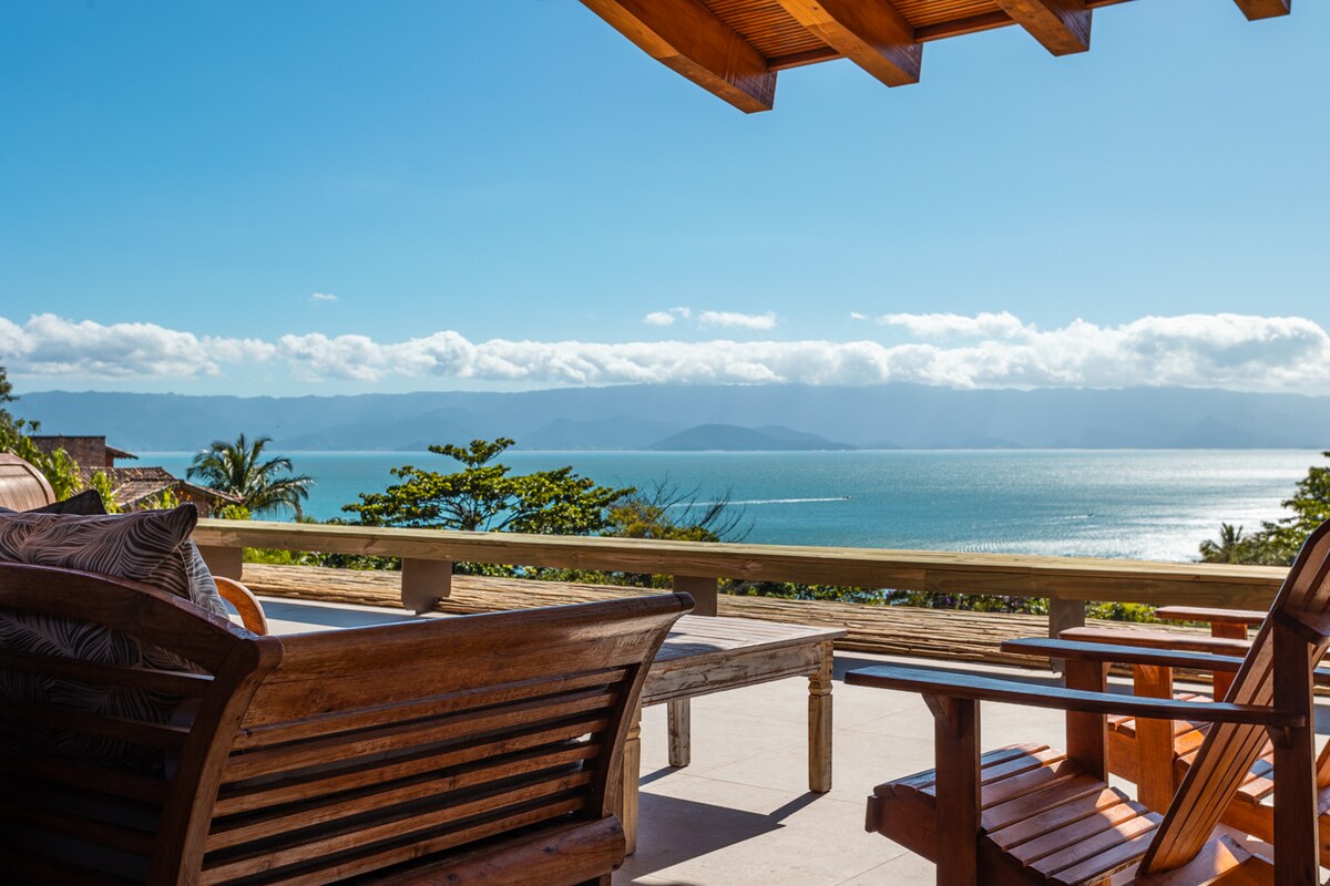 Casa exclusiva frente al mar junto al faro de Ponta Grossa en Ubatuba. Tiene capacidad para 14 personas con 4 suites, todas con impresionantes vistas al mar. Acceso privado al muelle con entrada directa al mar para nadar, piscina climatizada, salón con barbacoa, ping pong, amplias zonas de estar y una cocina totalmente equipada con congelador y freidora de aire. Ubicado en la ruta de las ballenas jorobadas con avistamientos frecuentes. ¡Se admiten mascotas!