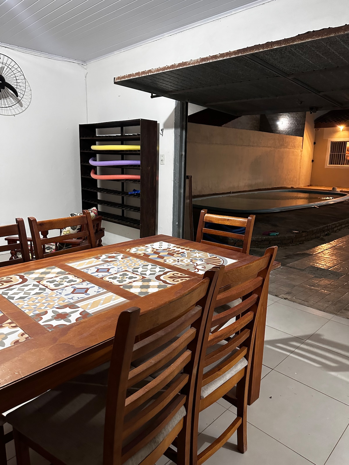 Casa muito perto da praia Pátio enorme, privativo, com piscina 3 quartos (2 com ar condicionado) 2 banheiros Sala Cozinha ampla - com mesa para 6 pessoas + mesa plástica para 4 pessoas Churrasqueira Smart TV Wifi Roupas de cama, mesa e banho Eletrodomésticos e ventiladores OBS: Não são permitidos visitantes ou hóspedes adicionais. A casa conta com câmera na área externa. Taxa de limpeza já inclui a limpeza e manutenção da piscina.