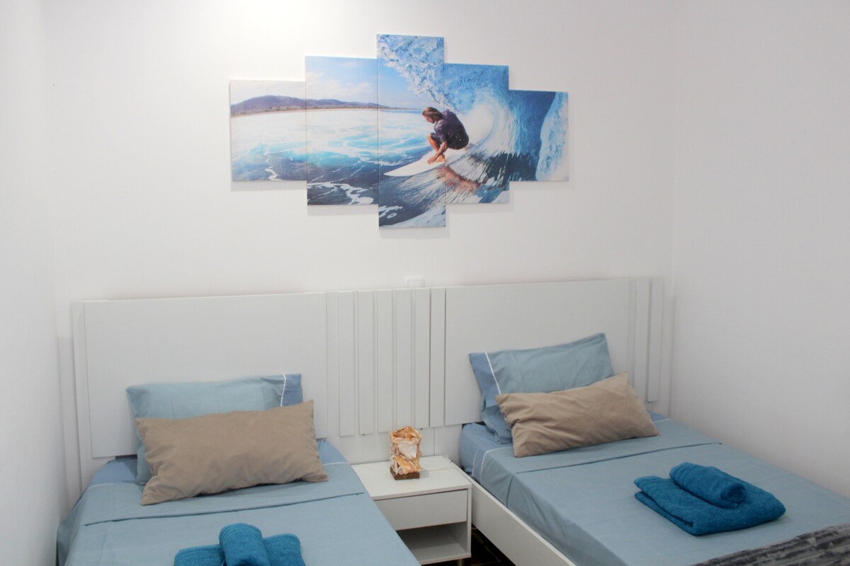 Elegante y acogedor apartamento de inspiración surfera ubicado en el antiguo edificio mediterráneo Casa Velha. Pequeño pero encantador apartamento de dos niveles que ofrece una cocina bien equipada y un baño privado y espacioso con ducha. Los techos altos con el elegante mural de palmeras y las tablas de surf le dan un toque de estilo contemporáneo. Uno de los aspectos más destacados es el acceso a un encantador patio con palmera y a la terraza de la azotea, donde podrás disfrutar de vistas panorámicas. A 5 minutos de la playa, el sol, el mar y las escuelas de surf cercanas.