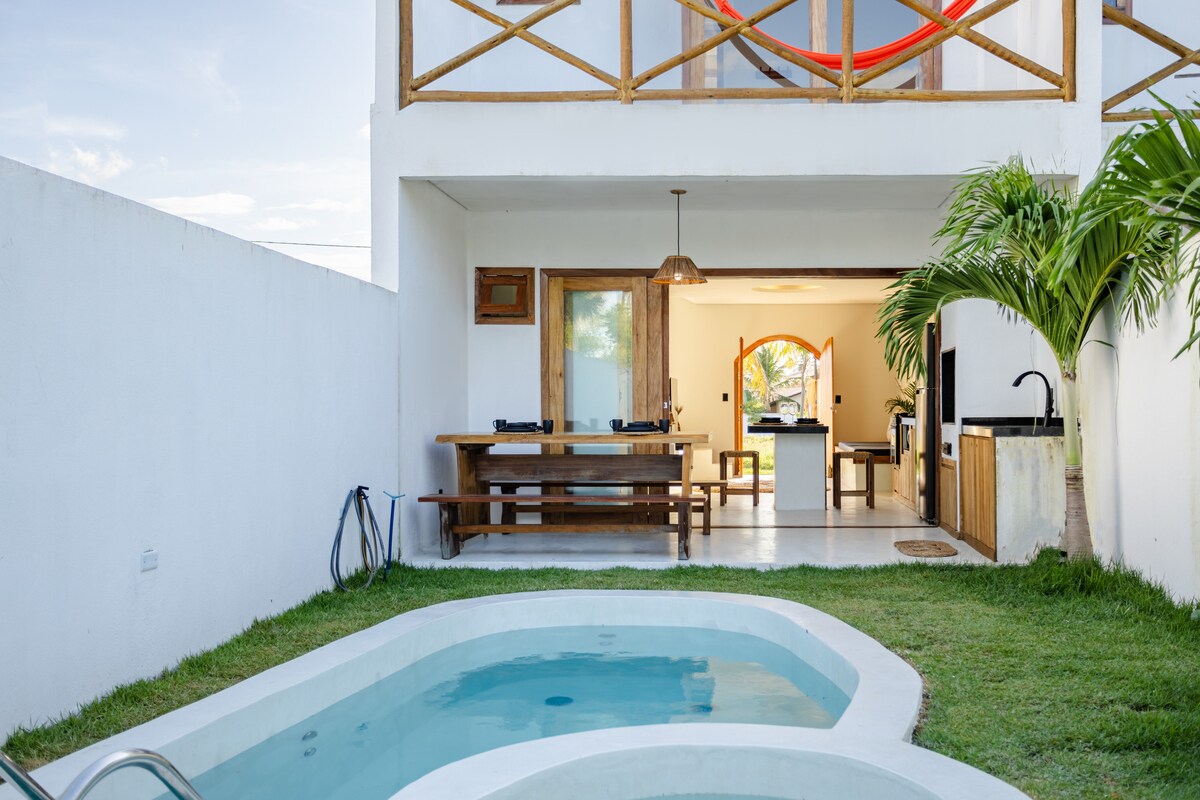 Encantadora casa en Preá, Ceará, a solo 900 metros de la playa. Perfecto para familias o amigos, cuenta con 2 dormitorios, 2 baños, una cocina totalmente equipada y wifi. Disfruta de la piscina privada con jacuzzi y relájate en las hamacas. Cerca de lugares de kitesurf y restaurantes locales, esta casa combina la comodidad moderna con un ambiente tropical. Un lugar ideal para relajarse y explorar la impresionante costa brasileña.