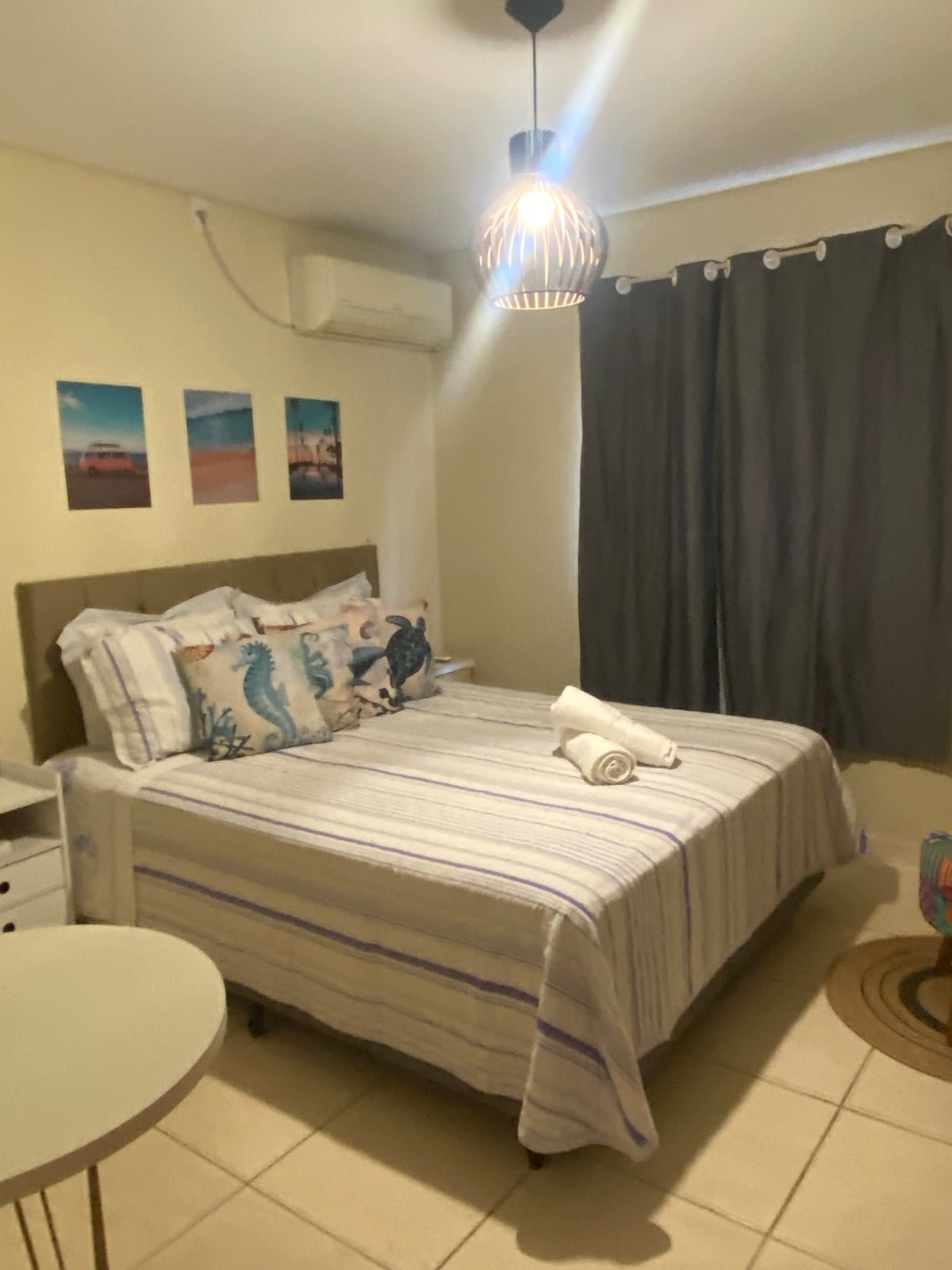 El apartamento está situado en una zona tranquila en Praia da Pinheira a 700 metros de Praia de Baixo, a 2 km de Praia de Cima y a 2,5 km de Guarda do Embaú. Tiene capacidad para 2 adultos y 1 niño; dispone de una cocina completa con fogones, horno eléctrico, microondas, tostadora, nevera, cafetera y licuadora. Sala con sofá cama y TV. Un dormitorio con cama doble, armario, espejo grande y ventilador. Baño con bañera de hidromasaje y ducha eléctrica. Además de un amplio balcón.