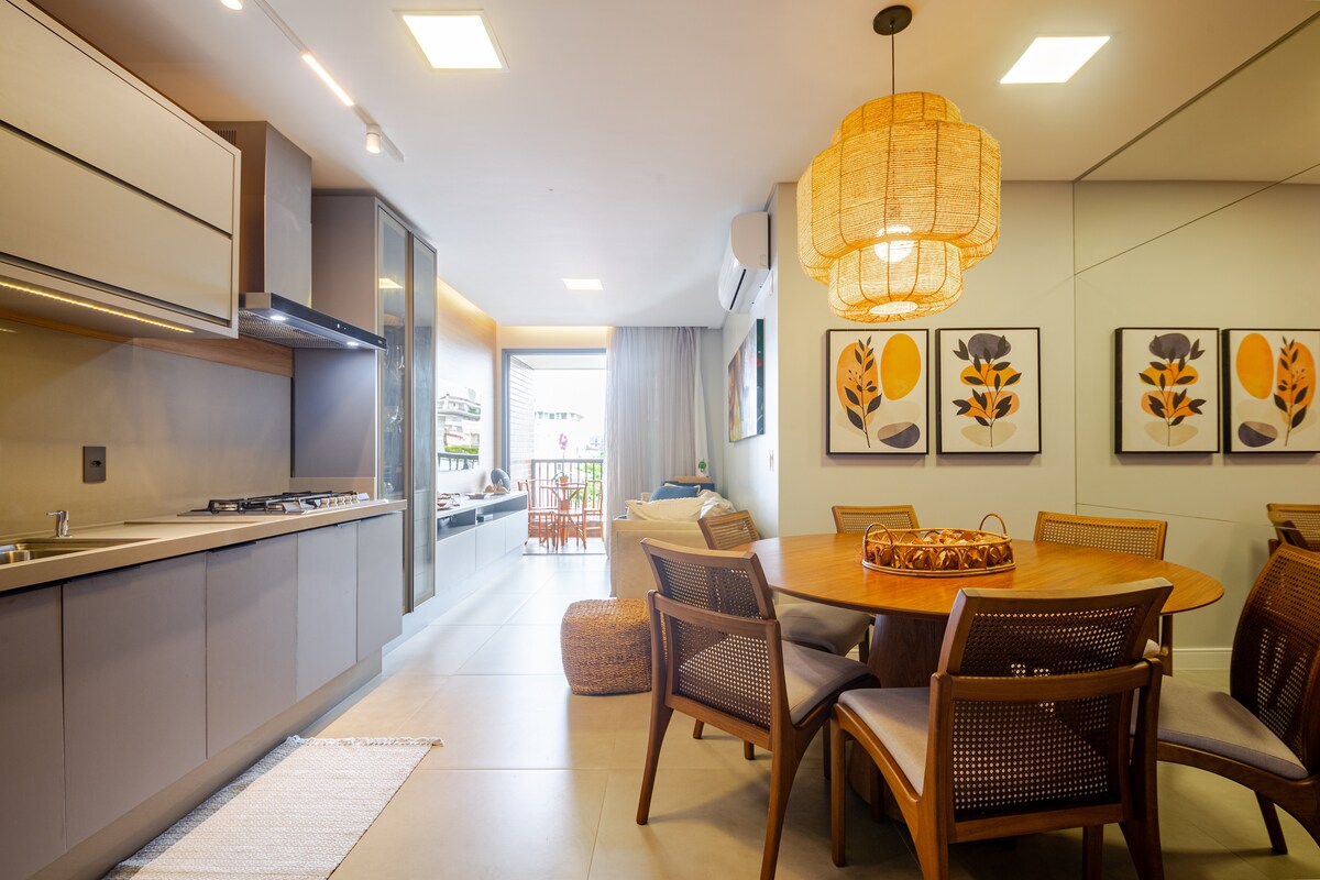 Maravilloso apartamento entre el mar y la naturaleza, 02 dormitorios con persianas eléctricas y aire acondicionado, 02 baños, TV cine 60” 4k con Netflix, Hbomax abiertos, Xbox One, Wifi, TV en todas las habitaciones, barbacoa en el balcón, muebles planificados en todos los ambientes, 02 lugares de estacionamiento cubierto, sillas de playa y sombrilla. Piscina para adultos y niños con playa y raia semiolímpica, cancha multideportiva, gimnasio, sala de juegos con sinuca y sala de juegos infantiles. Apartamento para recibir a su familia