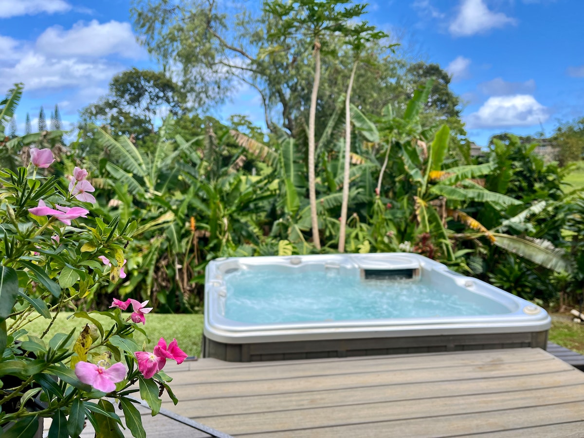 Ubicación, tiendas, playas, bañera de hidromasaje, aire acondicionado y SUP. ¡Las vacaciones de tus sueños te esperan en esta espaciosa y serena casa! Ubicación ideal, a pocos pasos de tiendas, restaurantes, vistas al atardecer, golf, golf de disco y las prístinas playas de esnórquel de Kauai. Disfruta de la majestuosa costa norte con equipo de esnórquel, tablas de paddleboard, tablas de bodyboard, sillas de playa y equipo de golf de disco incluidos. ¡Esta hermosa casa con vistas tranquilas al campo de golf, lanai privado, bañera de hidromasaje privada, cocina, parrilla y camas súper cómodas te espera!