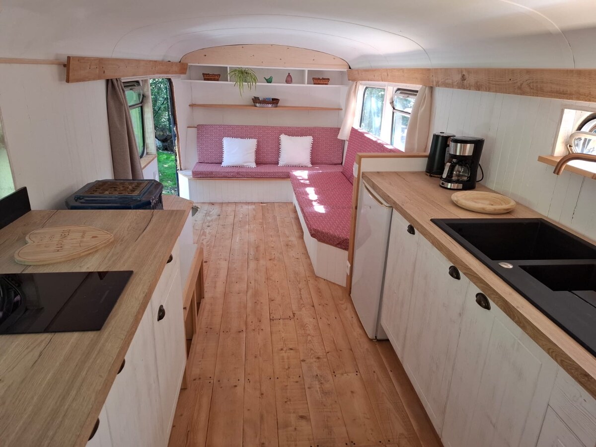 Charmante roulotte de cirque des années 50 aménagée avec amour. 3 m de large sur 11 m de long, entourée d'une terrasse donnant sur un jardin ravissant. Un poêle à bois pour rester bien au chaud en hiver, une chambre avec un lit double, une grande douche, un salon équipé d'un canapé lit pouvant accueillir confortablement une personne en plus. Idéale pour les weekend en amoureux ! We speak english everyone welcome !