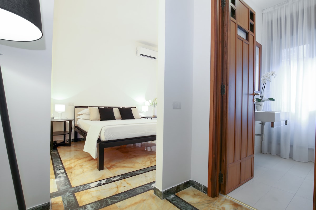 Nuevo apartamento con entrada independiente en dos niveles, finamente restaurado, en el centro histórico de Salerno, cerca de la plaza de Largo Campo, Via Roma, Piazza della Libertà, el Duomo y los jardines de la Minerva. Ubicación estratégica tanto en verano, ya que se puede llegar a pie a la parada de autobús y a la estación marítima desde la que parten los transbordadores hacia la costa de Amalfi, Capri, Isquia, etc., como en invierno, ya que se encuentra en el corazón de las luces del artista.