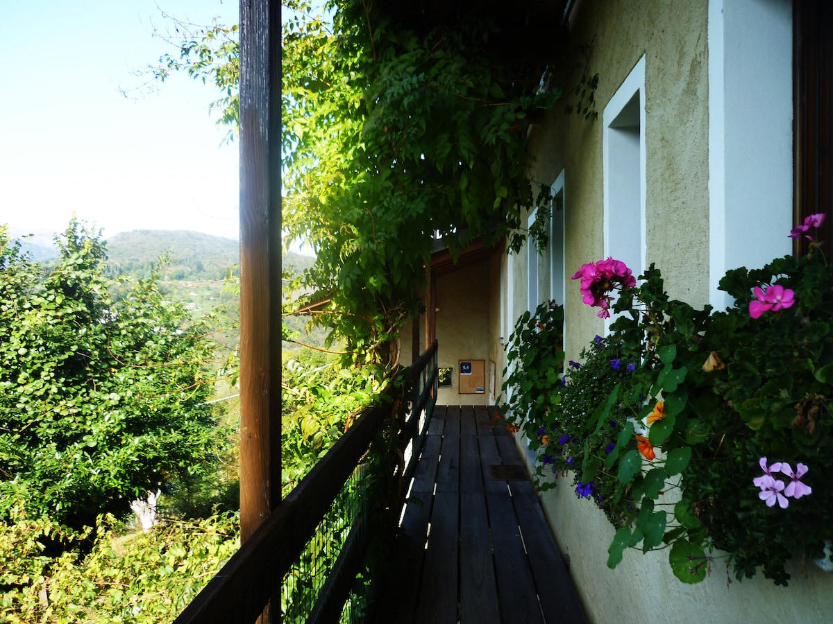 Alloggio in casa liberty, tennis, park con vista incantevole. Due locali,cucina living, servizi . Area esterna per pranzo e cena. Cozy flat with amazing sightseen. WiFi, TV, air conditioning portable, tennis ,ext 5x3 pool (summertime), private parking. All backyard available! spring/summer only for our guests. Pool, tennis, mountain bikes, 2 barbecue, private external area,20. 000 mq/sm garden, cats :-) FULLY SANITATION Home restaurant exclusive for Guests, ON REQUEST
