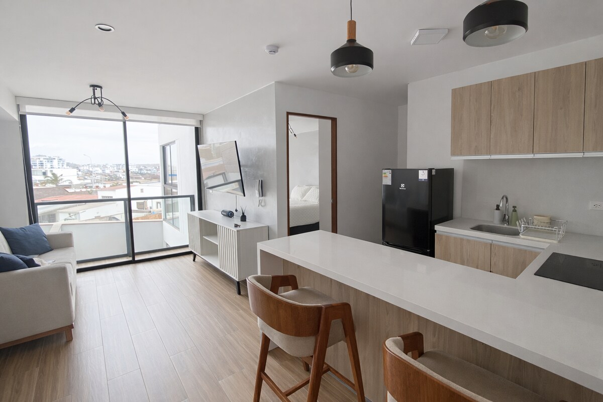 Miniapartamento tipo loft , con vista al mar. Perfecto para pasar unos dias inolvidables en pareja. Cuenta con cama king, mueble cama, tv smart, wifi, cocina a gas, menaje, sala, mini comedor, baño con terma agua caliente, lavadora. Además, podrás aprovechar unas noches fabulosas escuchando el sonido del mar y disfrutando de una hermosa vista. La playa es pequeña, casi privada. La piscina es un area común de la casa, habilitada de 10 am a 6pm. NO BRINDO TOALLAS NI ARTICULOS DE ASEO PERSONAL.