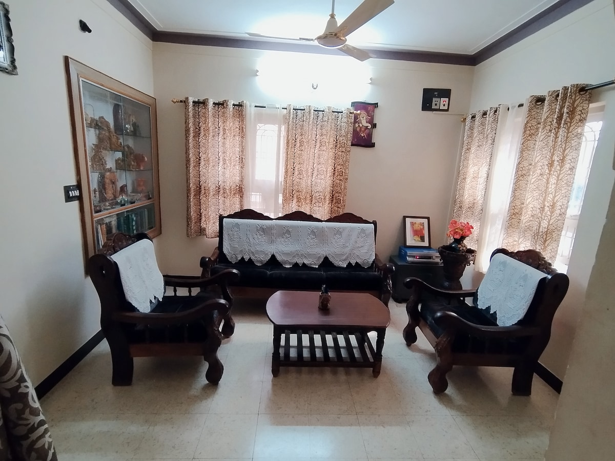 ¡Hola! Soy Hema, tu anfitriona. Bienvenido a mi casa familiar de más de 45 años, perfectamente situada en una bulliciosa carretera principal en el corazón de JP Nagar, Bangalore del Sur. La casa, un espacioso 1BHK en el primer piso, es ideal para personas que trabajan desde casa, viajeros de negocios y de placer, y está rodeada de tiendas de alta gama, centros comerciales, cafeterías, bares, restaurantes y lugares culturales. Con las líneas de metro verde y amarilla, tienes acceso rápido al CBD, Electronic City y barrios como Jayanagar, Koramangala y HSR.