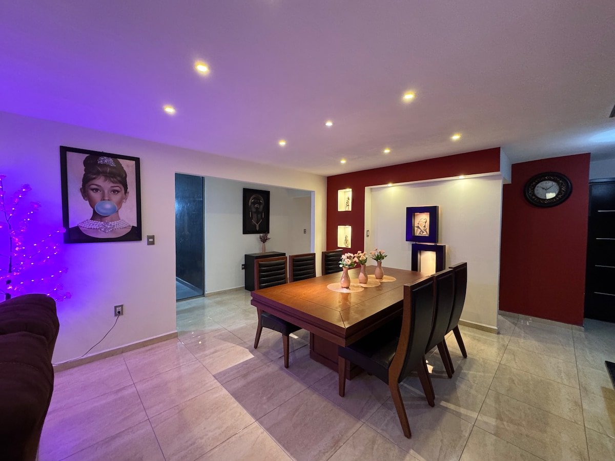 Casa amplia, moderna y totalmente equipada para hasta 10 personas, ubicada a solo 15 minutos del Paseo Turístico Aura Corazón de Roble es ideal para descansar, convivir y celebrar. Cuenta con excelente iluminación, espacios abiertos, perfecta para reuniones, para disfrutar en familia, amigos o eventos privados. Se encuentra en una zona estratégica. Las convivencias, fiestas o reuniones tienen una tarifa diferente al hospedaje. El uso de la alberca no está incluido en el precio base.