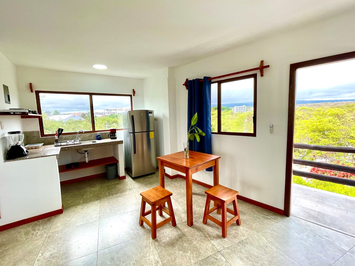 Éste alojamiento único, se encuentra en el tercer piso, tiene una hermosa vista al mar, a solo 3 minutos de la playa ¨La Estación¨y la ¨Fundación Charles Darwin¨, es cómoda y acogedora, lejos del ruido urbano, cuenta con internet de alta velocidad. Se encuentra además sobre una cafetería con deliciosa comida sana y artesanal, donde los fines de semana se desarrollan eventos culturales y es un espacio ideal para coworking.