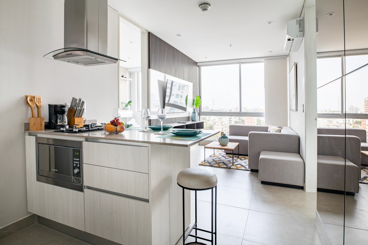 Disfruta de una experiencia inolvidable en este moderno apartaestudio tipo loft en el piso 9 de GZ Tower: * Check-in y Check-out flexible *WiFi 900 Megas *A 1 cuadra de la clínica Iberoamericana y a 3 cuadras del Viva Mall. *1 habitación con cama Queen y aire acondicionado. *Sala con sofá cama y aire acondicionado. * Lavadora-secadora *Gimnasio Smartfit cerca (de pago). *Estacionamiento privado gratuito. *Ubicación ideal: Cerca de centros comerciales, principales clínicas y zonas turísticas.