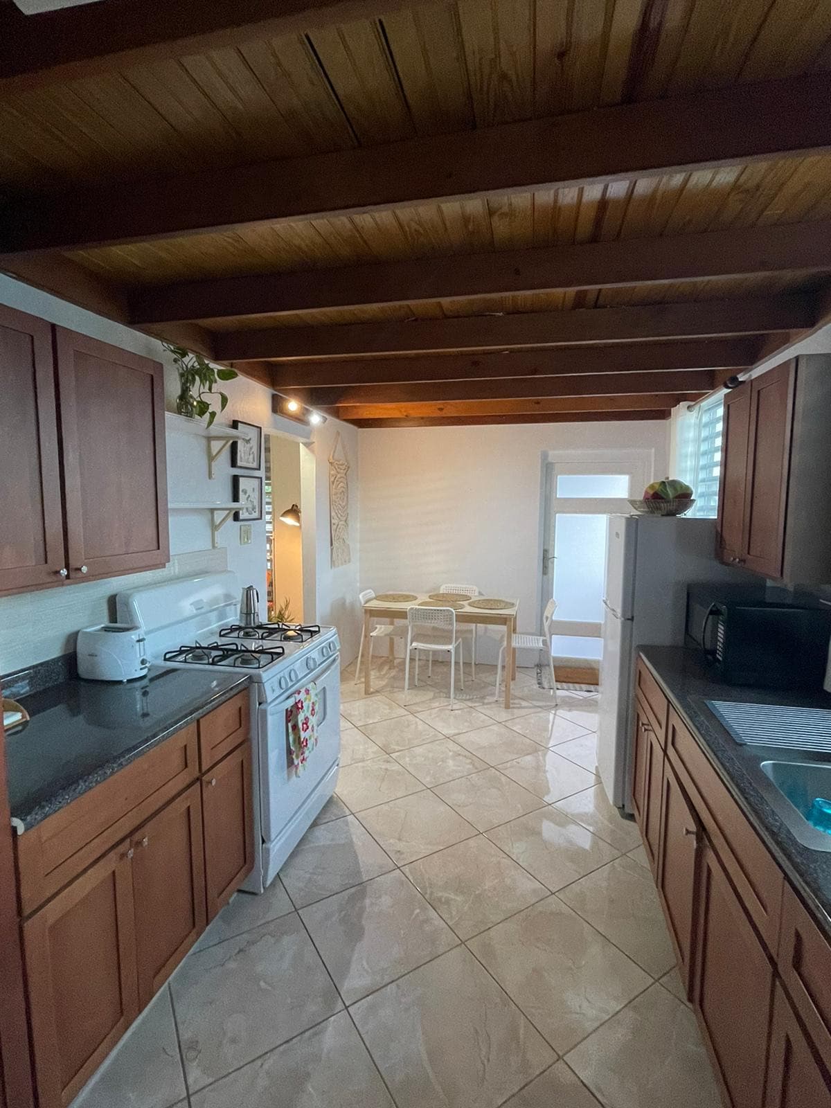 Disfruta del apartamento privado de la planta baja en nuestra casa de dos pisos. Cuenta con una cocina abierta completa, comedores interiores y exteriores, una cama tamaño queen en el dormitorio con aire acondicionado, un sofá que se convierte en una segunda cama y una ducha con agua caliente. Hay televisión inteligente. La entrada es privada y el estacionamiento está justo delante del apartamento. Se encuentra en Villa Borinquen, a 5 minutos en coche o a 25 minutos a pie de la estación de transbordadores y de las zonas de surf.